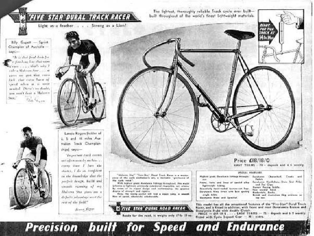 “In 1939 Malvern Star introduced their Five Star model. It remained their “top of the range” racing model through to the 1960s picking up World Championships, Olympic Gold Medals and Empire Games Gold Medals on the way.”