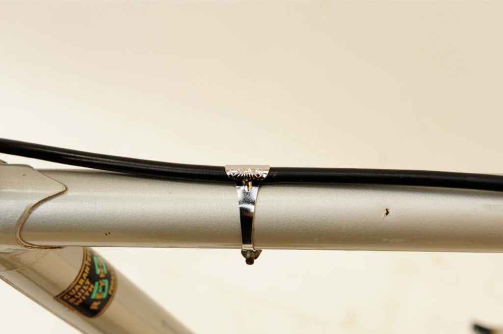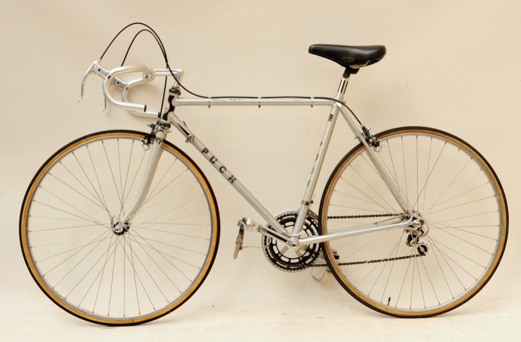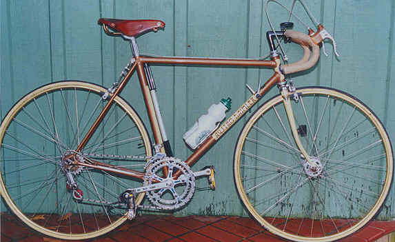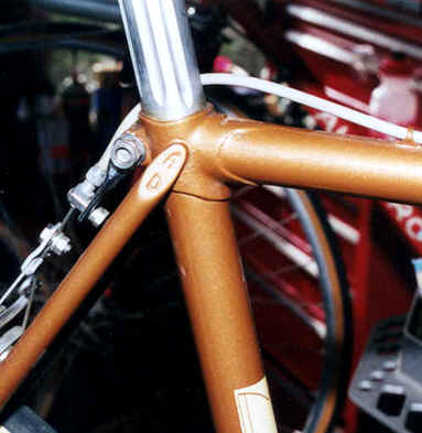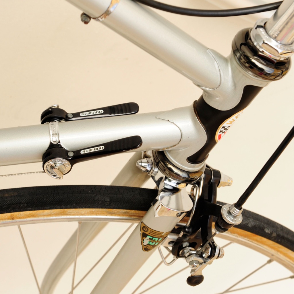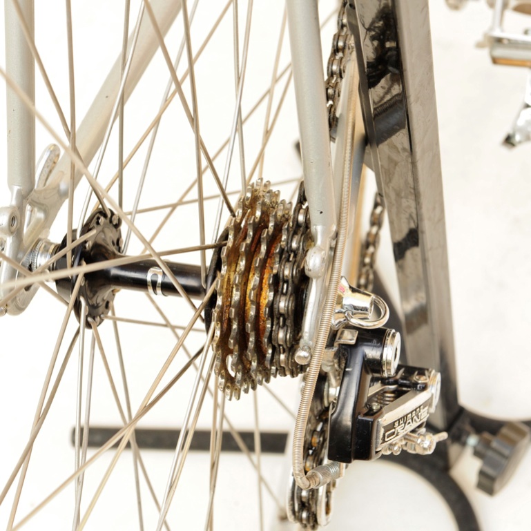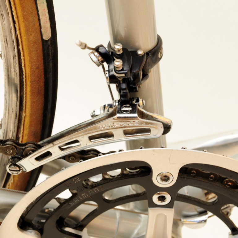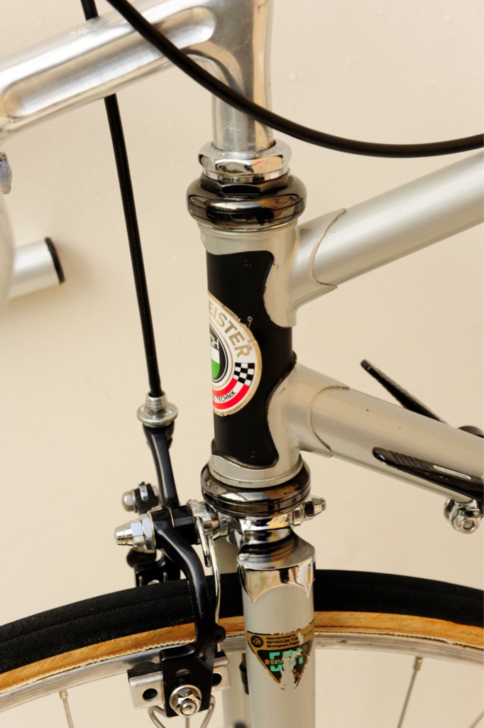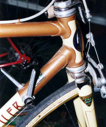 “This was purchased as a frameset (orig. color suggests the Superleicht model) in the early 80’s. The cream colored sections are original. The chocolate brown parts are a repaint by the late Ray Gasorowski of Romic Cycles in the mid to late 80’s. At my request, he masked off the original parts so as not to destroy the original decals.”