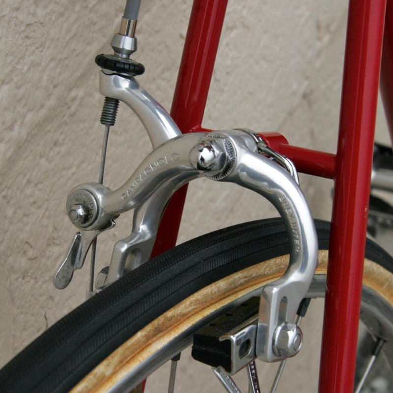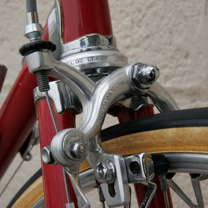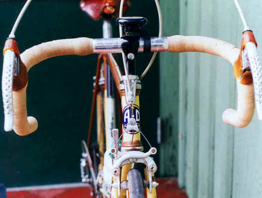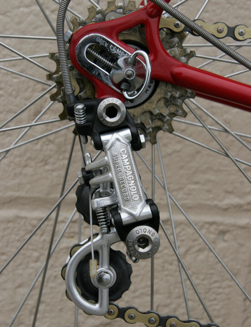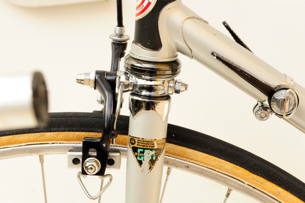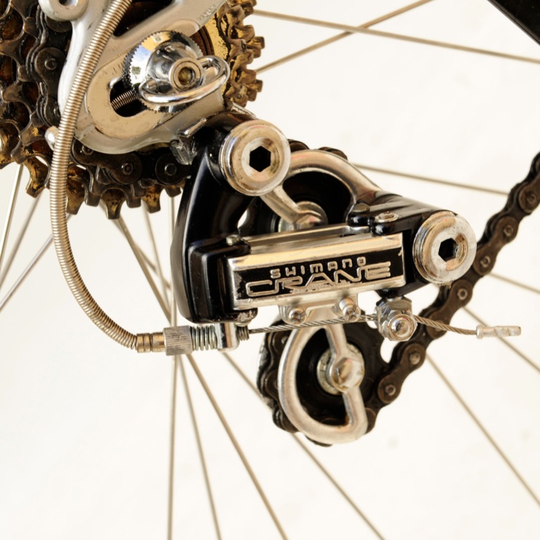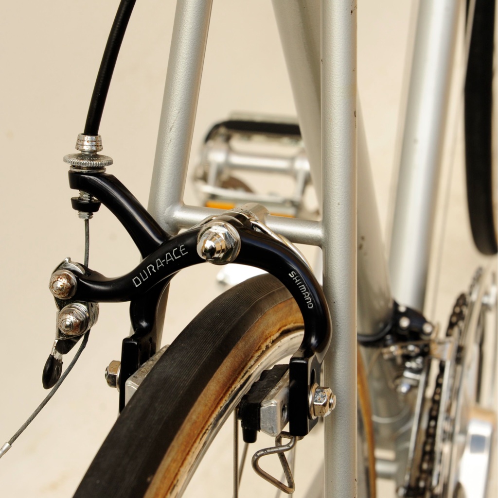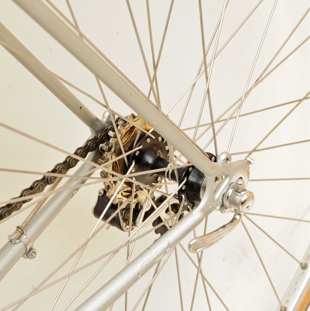 “This was purchased as a frameset (orig. color suggests the Superleicht model) in the early 80’s. The cream colored sections are original. The chocolate brown parts are a repaint by the late Ray Gasorowski of Romic Cycles in the mid to late 80’s. At my request, he masked off the original parts so as not to destroy the original decals.”