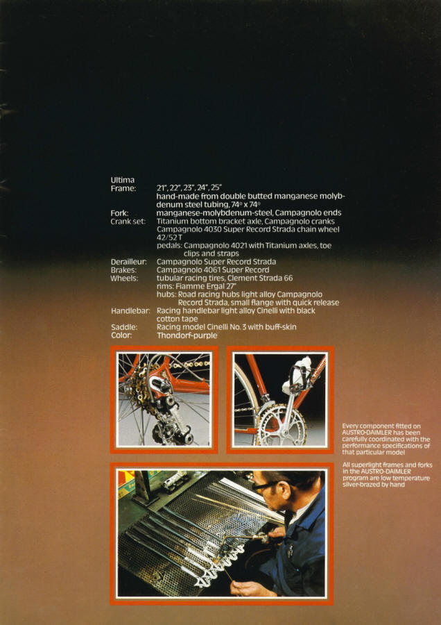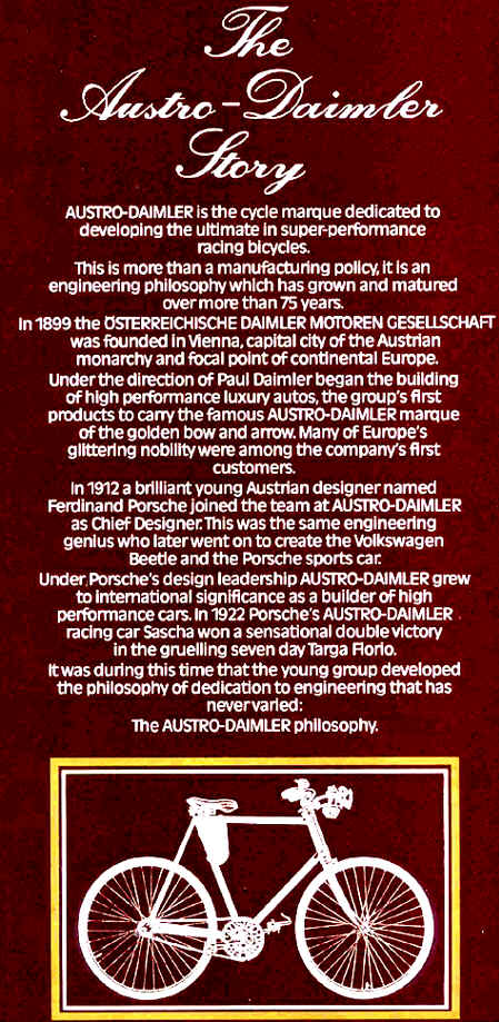 “…the bicycle manufacturing aspects of the consortium were sold in 1987 to Piaggio & C. S.p.A. of Italy, the Puch trademark was conveyed however, the rights to the name Austro-Daimler were not sold. Since then no bicycles have been made bearing this trademark.”