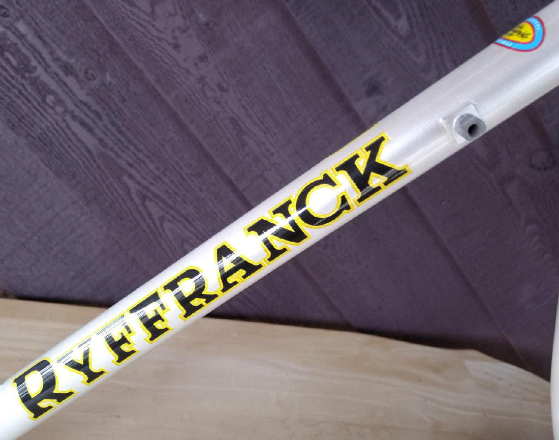 He mostly used Reynolds and Columbus tubing, along with Henry James and Cinelli lugs. Ryffranck was a certified Reynolds 753 builder, and only silver brazed his frames (regardless of the tubing selected) and hand filed his miters. Most of his frames were painted by Cycles Marinoni in Montreal. His frames are known for their fastback seatstay clusters. When building full bikes, he was infamous for only equipping his frames with Campagnolo components; many of his frames featured a Campagnolo oval decal between the shifter bosses.