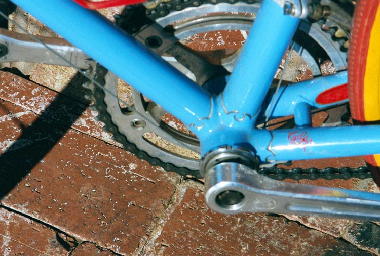 “It was a small shop and had the frame making part in the back where several artisans worked fitting, filing, welding, and then painting the frames they made. In my case, one of the men who had been making frames all his life came out from the back, asked some questions, took some measurements, and then just looked at me. Then he went back into the back and in about 3 weeks both the bikes that had been given to me by my Italian team were ready. 72.5 degrees for the seat and head tubes, but I forget the rest of the measurements. The seat tube is 52 cm. Campagnolo gears and axles, Mafac brakes, Regina cassette and chain, Fiamme rims, and Clement sew-up tires. The frame was made from Reynolds 531 double butted tubing and fully lugged, as you can see from the photos. It is still the sweetest frame I have ever ridden, far more comfortable than anything else I have ridden, even the most modern composites.”