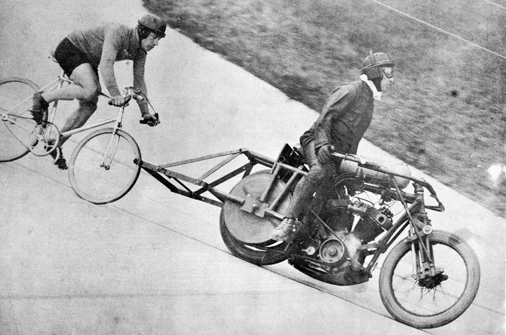 Hilary Stone: “…Harry Grant … at his first successful attempt on the hour motor-paced record at the Parc des Princes, Paris, July 1932 and paced by Leon Vanderstufyt on a massive pacing machine with a roller 60cm behind the rear wheel, he broke the world records for five, 10 and 50km going on to set a new distance for the hour record of 52 miles 215 yards riding a Selbach taper tube pacing machine… “