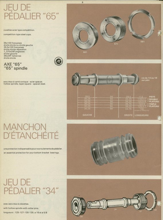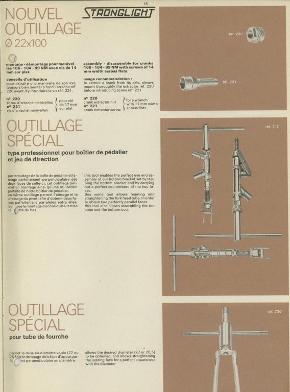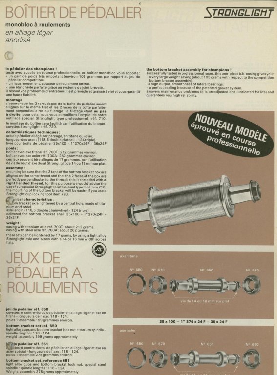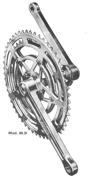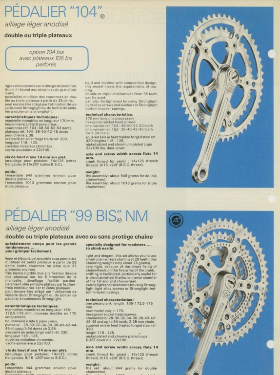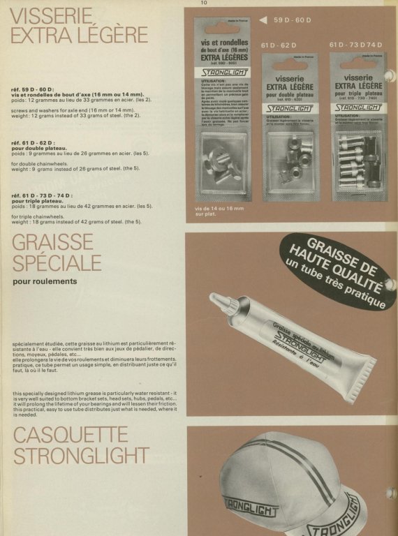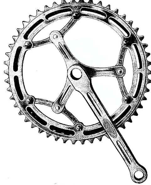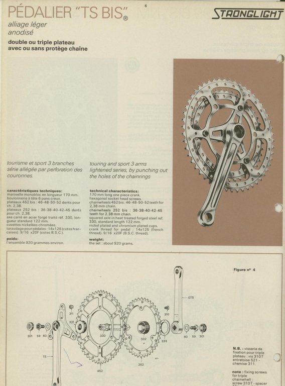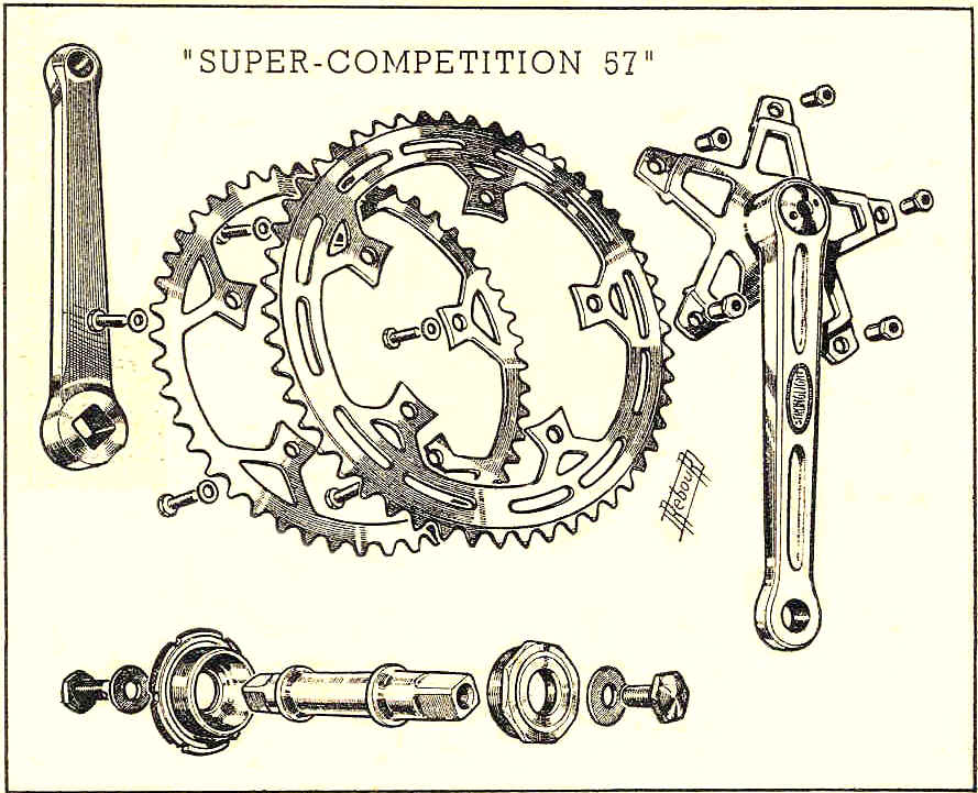 “Stronglight, the Stephanoise firm who before the war introduced the square fitting for crank spindles, has perfected its products by attaching the second and third chain rings with countersunk bolts and nuts with six hollow faces, a system that has been long desired.”