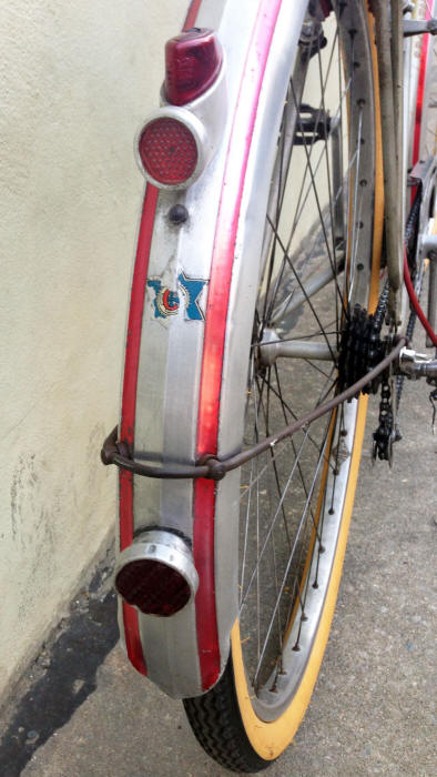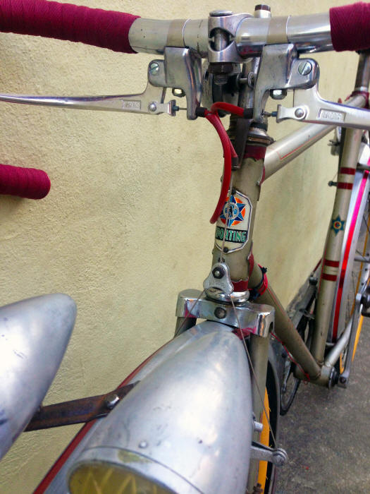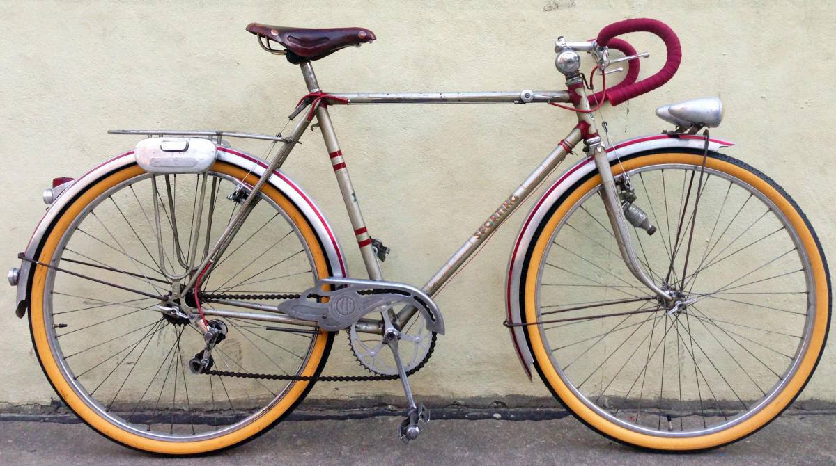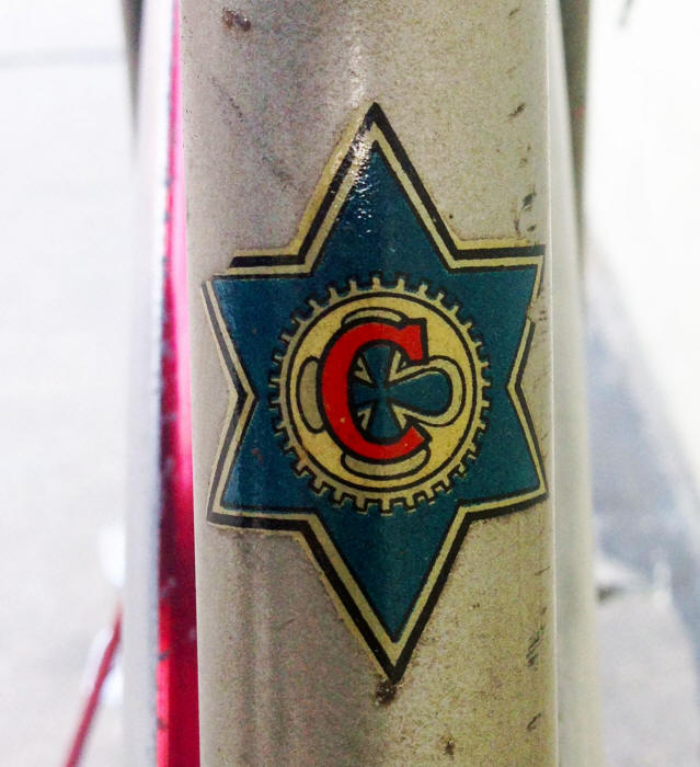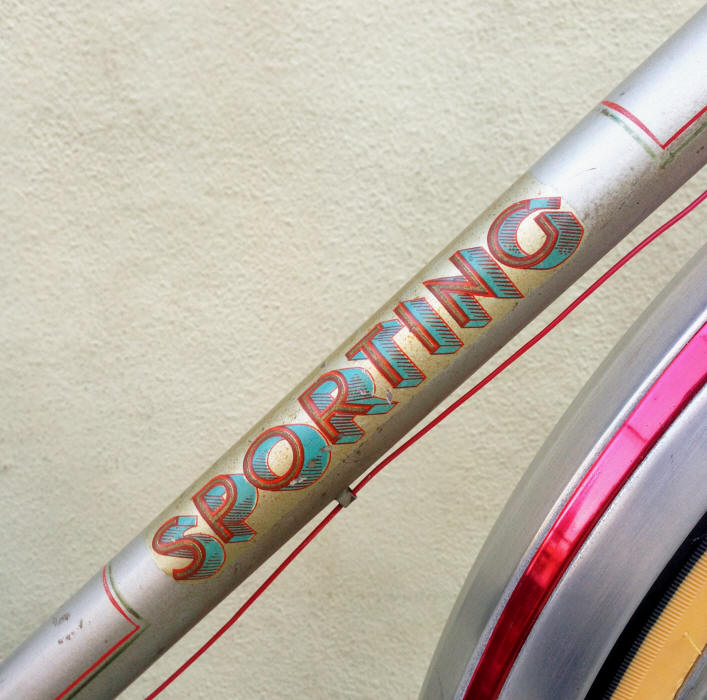 “… has the name “SPORTING” on the down tube, and a distinctive Star of David logo on the down tube, and rear fender. The head badge says “SPORTING” and shows what looks to be a roaring lion superimposed on a chain ring with the Star of David behind it. The logo on the down tube is a capital “C” superimposed on a cross or a clover, surrounded by a chain ring, with the Star of David behind it.”
