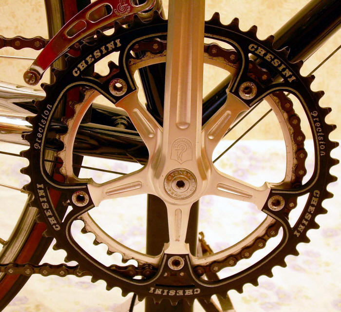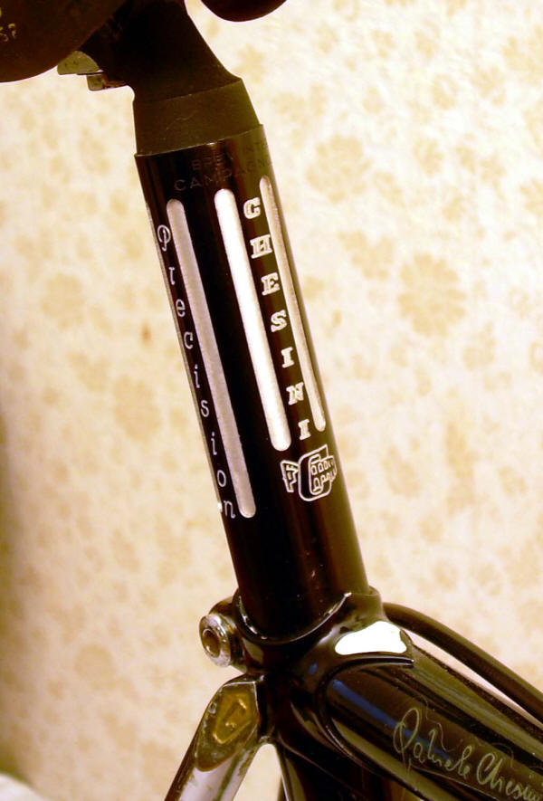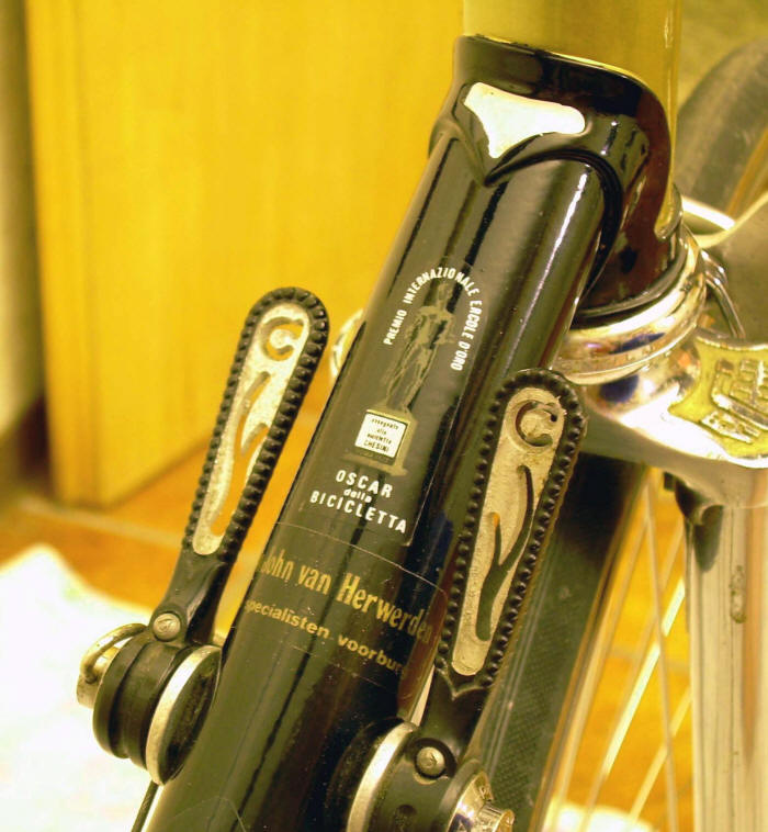 “Early 1930’s Cicognani frame is Columbus tubing, fully chrome plated, integrated headset, and very nicely made. Something along the lines of a pro level road race frame.