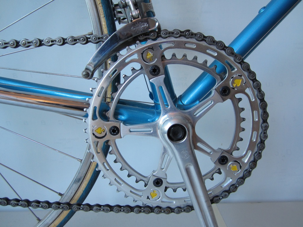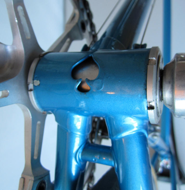 COLNER bikes go back to at least 1978, a brand said to be devised to get around the UCI rules that only allowed a sponsor to have 1 cycling team. In addition, this brand could be sold to dealers in a region where there already was a protected Colnago dealer. Colner supplied the Italian pro team “Vibor” that year with green colored bikes and raced in the Giro d’Italia. Vladimiro Panizza was their main rider. These frames feature a spade shaped cutout, not clubs (“flowers”) as in Colnago.