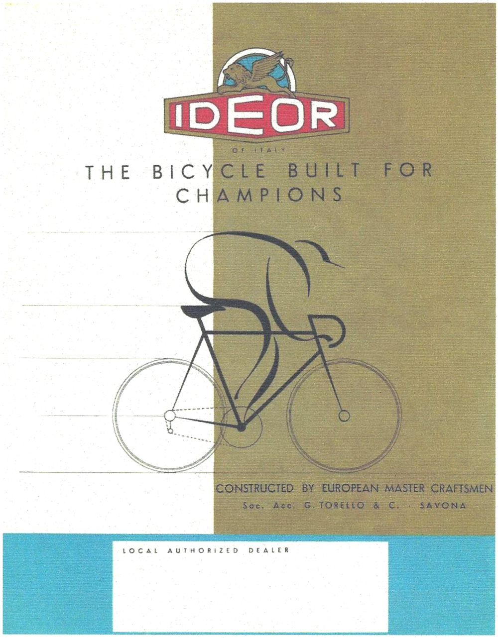 “Ideor at one time sponsored a professional racing team. They existed in 1954 at least, as a Spanish team, and the great cyclist and cycling personality, Raphael Geminani, rode for them, as well as the Spanish rider Salvador Botella Rodrigo. Their team color was purple, and they had really cool jerseys with the Ideor typeface. Here is a link to their team standings”