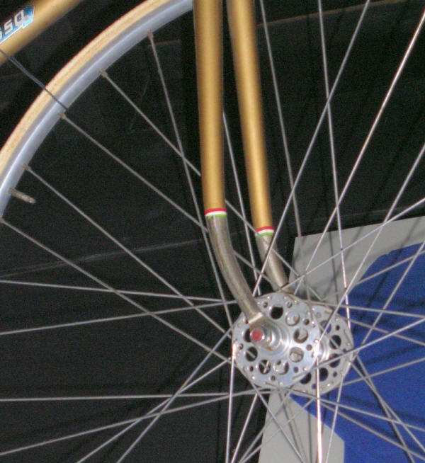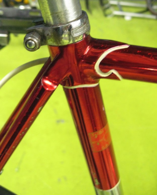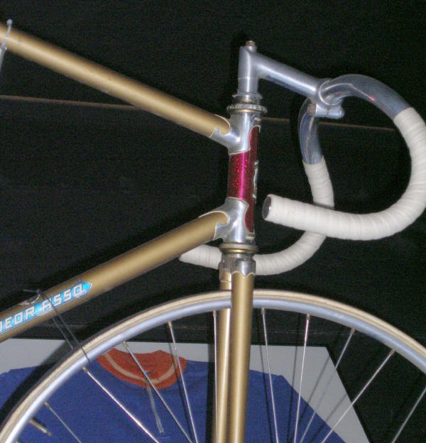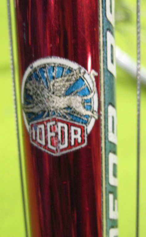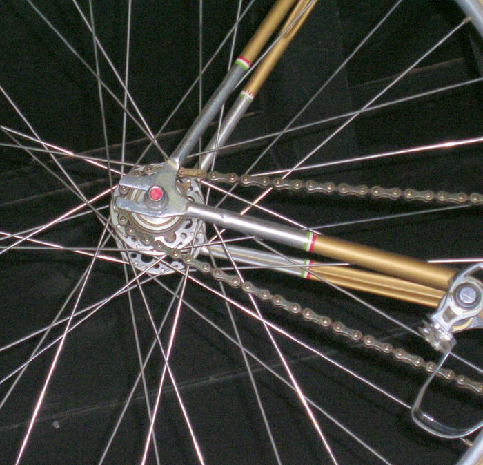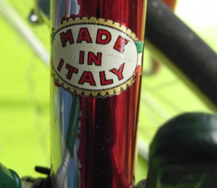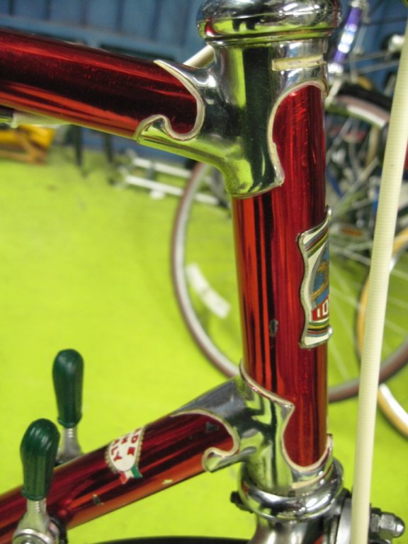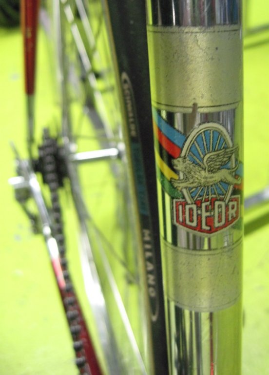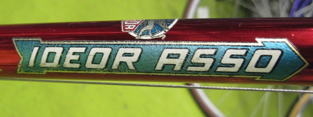 “There was the large IDEOR Asso decal on the down tube, the winged lion band decal on the seat tube, lovely model decals on the fork blades, a smaller winged lion decal on the top of the down tube, a small silver “Made in Italy” rosette on the top of the top tube, just behind the head tube, and a Columbus tubing decal on the seat tube, just below the seat cluster lugs. There was also usually a distributor/retailer decal on the lower section of the seat tube.”