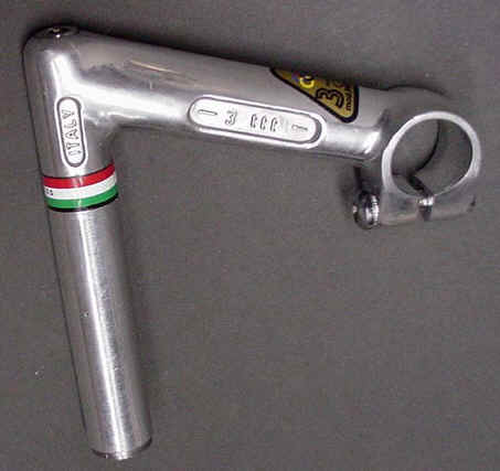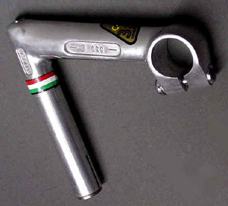 3ttt stems were originally known as Ambrosio, which also made bars and rims, both in aluminum and steel. The Ambrosio “Champion” family goes back to at least 1953 (page 190 “World of Rebour”). The “Champion” was available in polished aluminum or chromed steel, and was still being sold as late as 1964 (Reliable Cycle catalog, 1964, page 42) Also available was the Ambrosio “Super Corsa” adjustable alu stem. The “Champion” came in 8, 9, 10, 11, and 12cm lengths. These stems were stamped “AMBROSIO CHAMPION” on top of the bulge where the bar passed through.