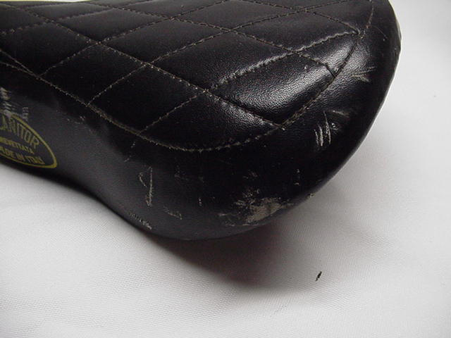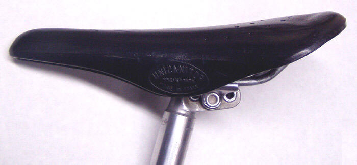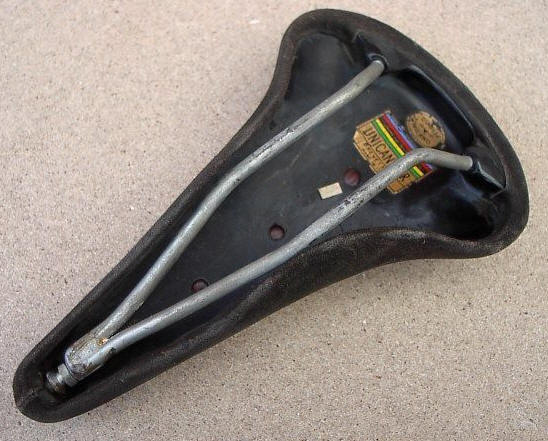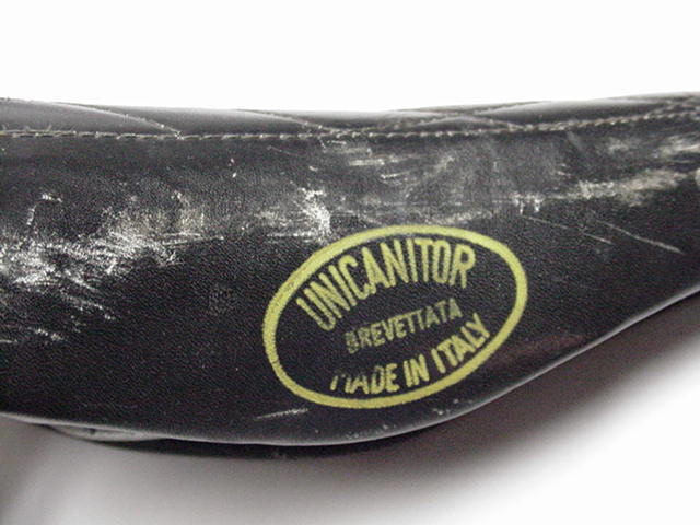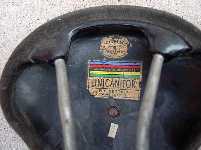 “The oldest/rarest Unicanitors (other than the uncovered ones that don’t say “Cinelli’) are covered in plain Leather and have labels in aluminum foil on the underside of the saddle. I have such a saddle and it came stock on a 1970 Cinelli Super Corsa.”