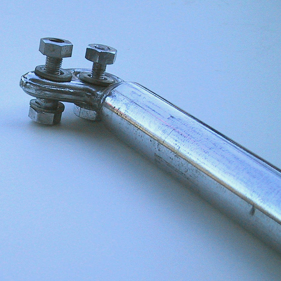 The single bolt on each side would grip the saddle rails and press the cradles against thick plastic discs around which the steel cradle inner frame will rotate to provide an infinite range of saddle level adjustment. The main section of the post is one piece forged alloy with only the saddle rail clamps in plated steel. Very effective and super easy to adjust. Especially nice compared to the two top-mounted (and nearly inaccessible) Campagnolo bolts… And, this mechanism really does not slip out of position!