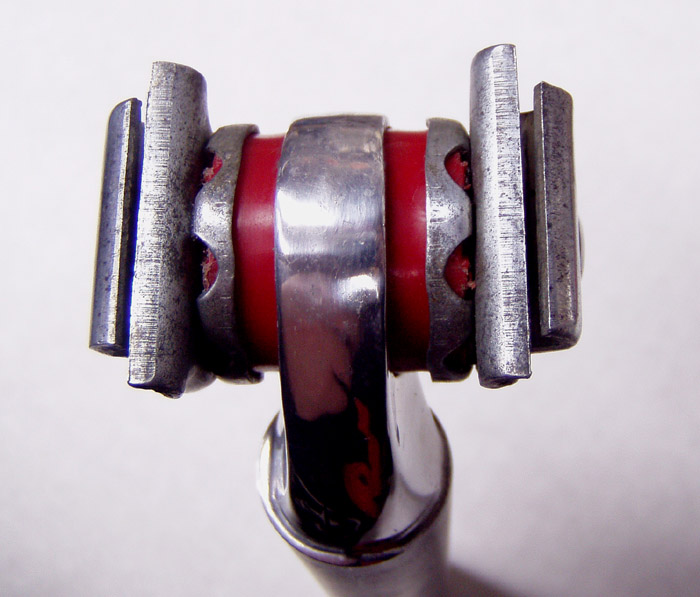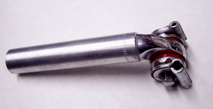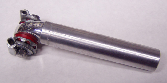 Introduced in 1963, this seat post was a GREAT improvement over both Campagnolo’s 2-bolt style micro-adjusting post or the steel seat pin clips for straight posts.
