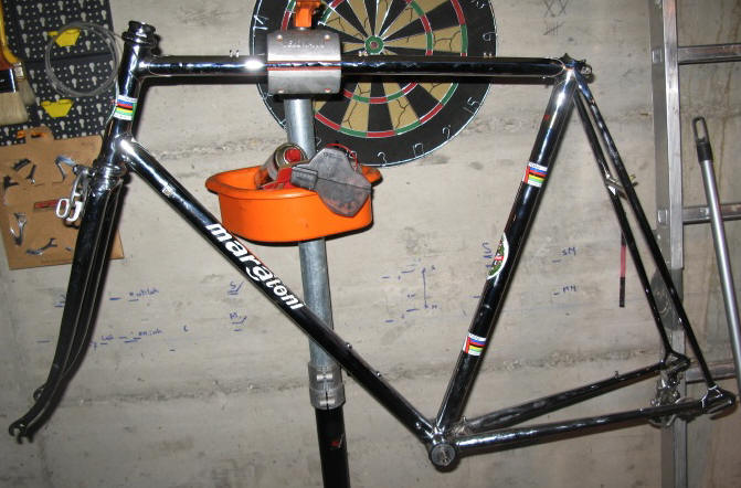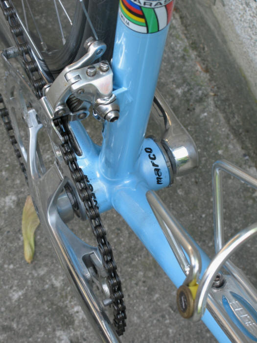 He built frames for a number of pros, including a time trial frame carrying Bianchi decals for Coppi, and a number of frames for Moser, including one used for one of Giro victories. He continued to race himself well into his 50’s. Today at the age of 87 (in 2009), he still rides (one of the last bike he built in the late 1990’s) and continues to support the riders of the Marco Marastoni club and will often be found to be building up and servicing bikes for club members (all free of charge). Another tidbit that was quite interesting is that when he stopped building frames on a regular basis, he passed his framebuilding equipment on to the Gozzi brothers of Rauler fame.