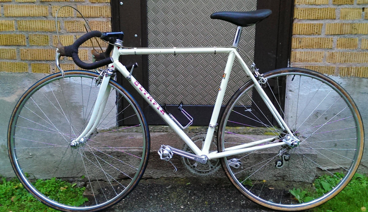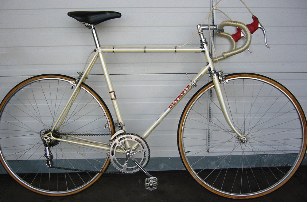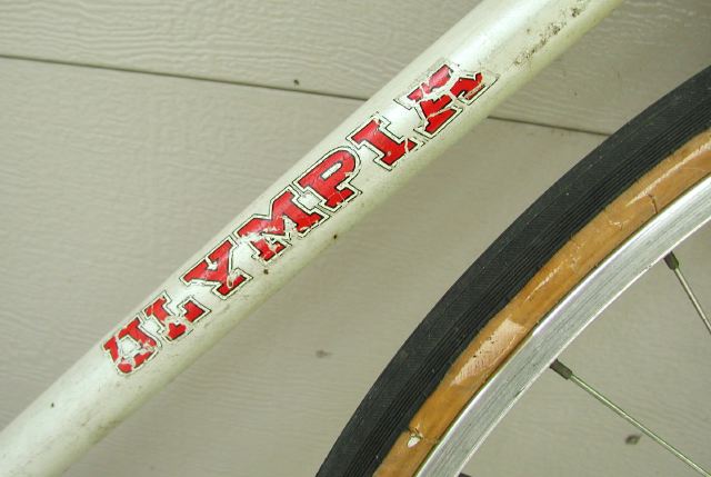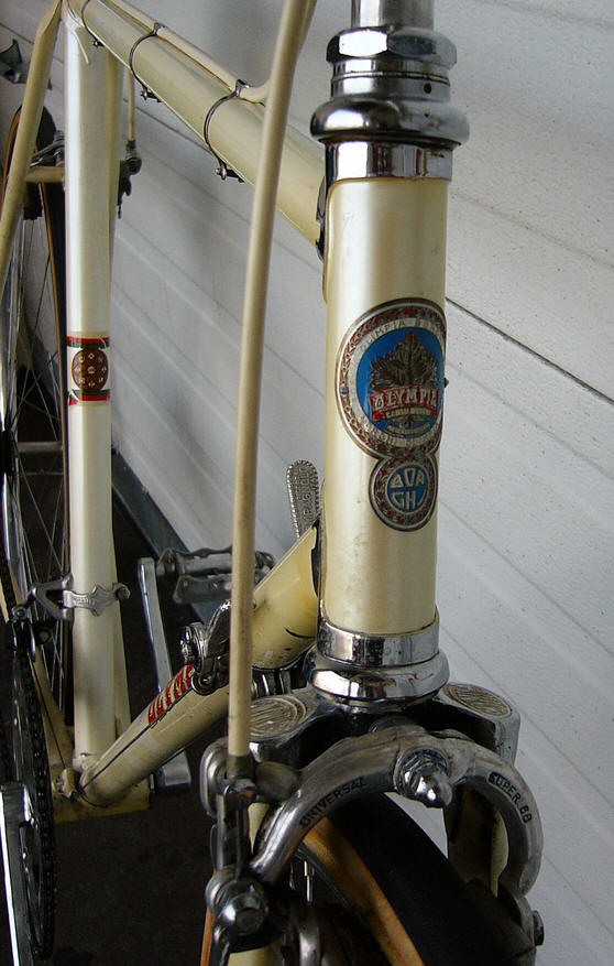 “About 500 Olympias were brought into the US in the early 1970s by Hagop Hakissian, who owned Charlie’s Bike Shop in Eastchester, NY. These were mostly good, entry-level 10-speeds: alloy hubs & rims, bars and stems, steel cottered cranks, Valentino derailleurs, Universal CP brakes, lugged straight-gauge frames. They were imported to compete with the Peugeot U0-8.”