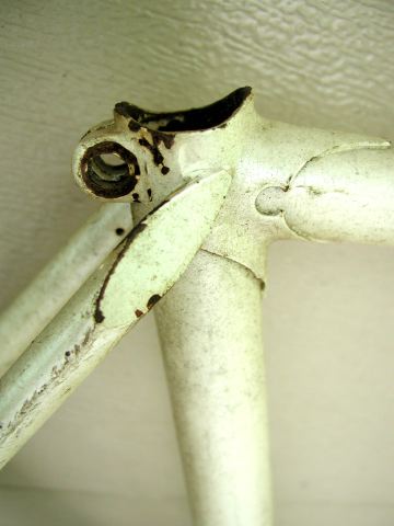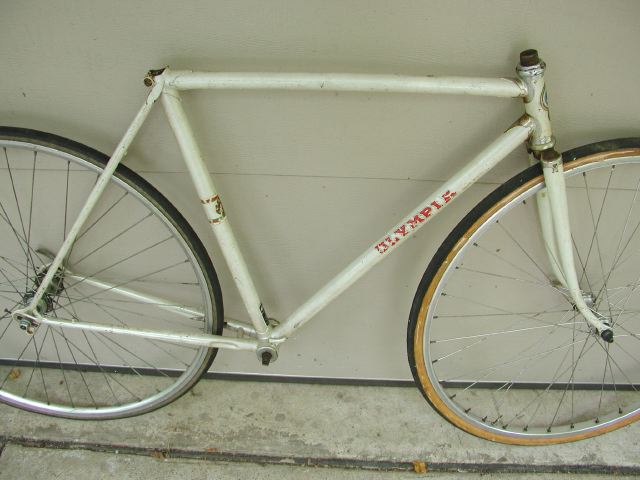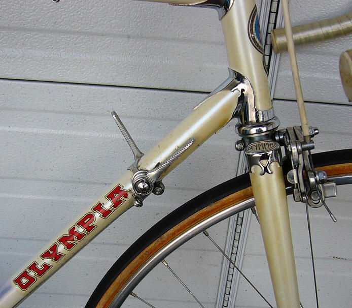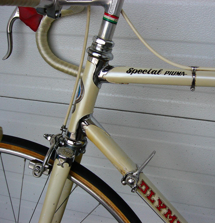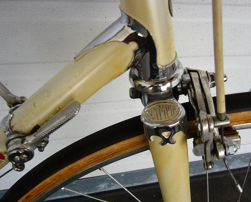“In 1959, the firm was bought by two bicycle makers, the brothers Antonio and Pasquale Fontana, to compliment their other, less exalted marques. These included Winter, Willes and San Remo. Olympia gave them an opportunity to compete with the best bikes on the market. Frame builder Augusto Daniele built their Competizione model, which was equipped with the top Campagnolo components. It featured carefully filed lugs, excellent torch work, short, upright geometry and a variety of bottom bracket cut-outs. Visually, it was distinguished by its long chromed, concave seat stay caps. The three top models (Comp, Special Piuma & Sprint Junior) had an unusual, fragile pearlescent finish. Unlike modern finishes, it used natural pearl essence, as found in nail polish, instead of metal or mica flakes. These bikes were antique white through the early 70s, then other base colors were used under the pearl (yellow, copper, blue and possibly others).”