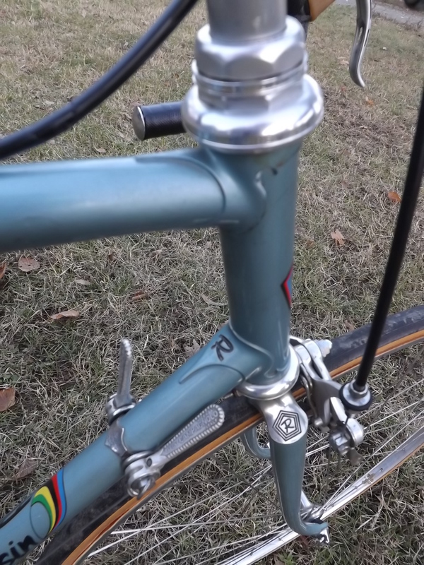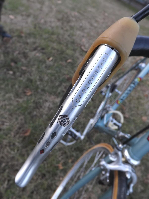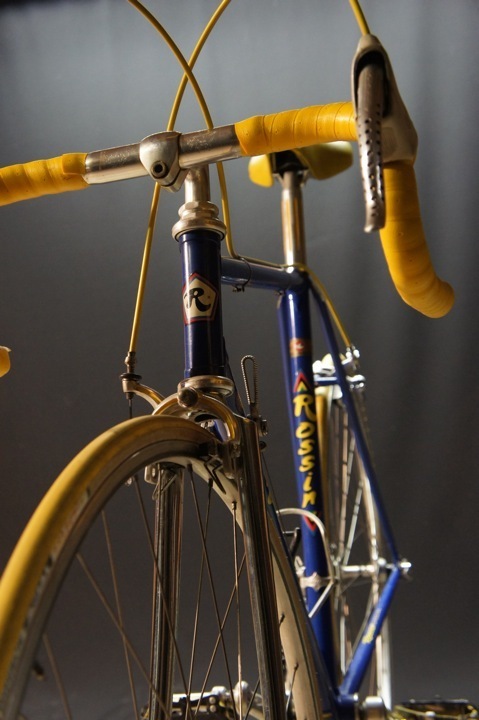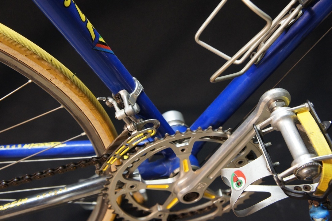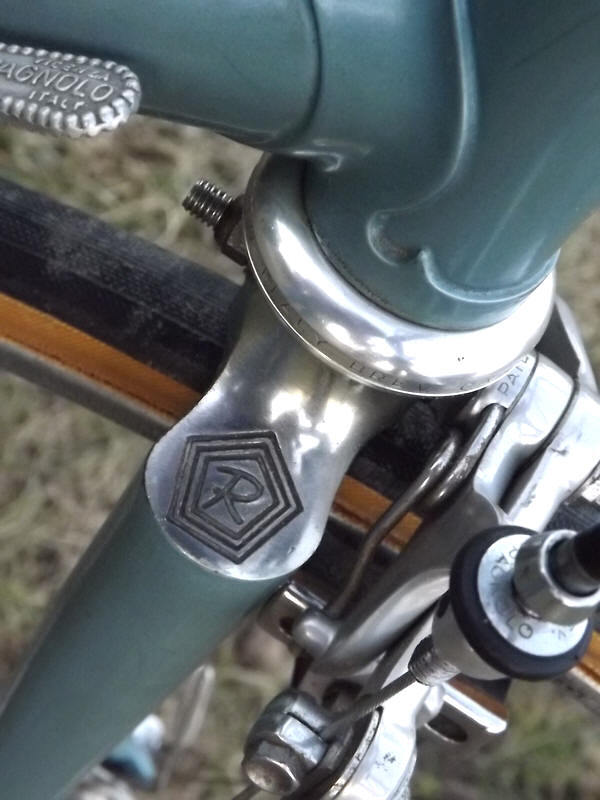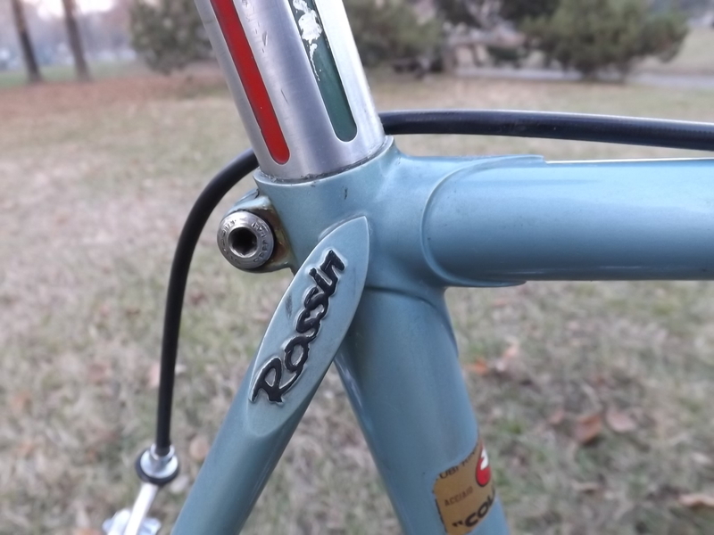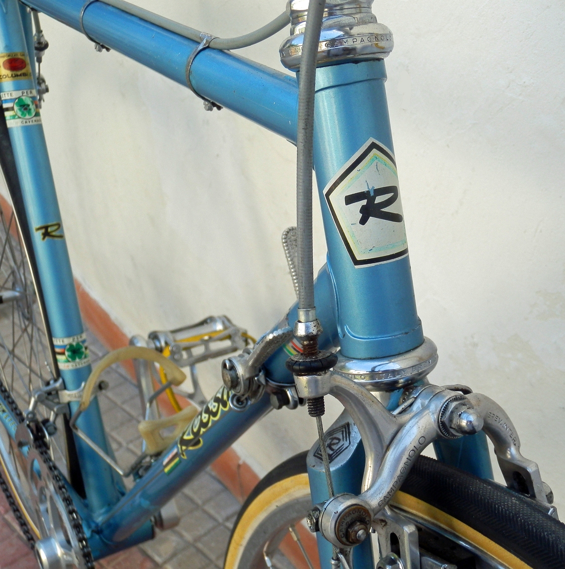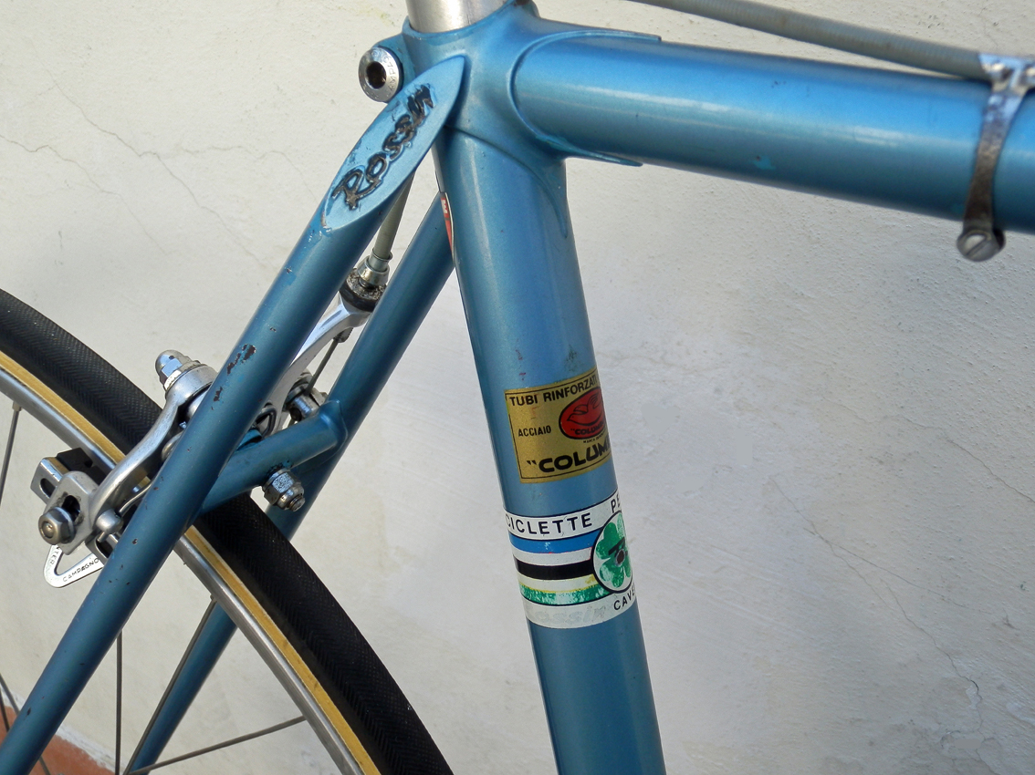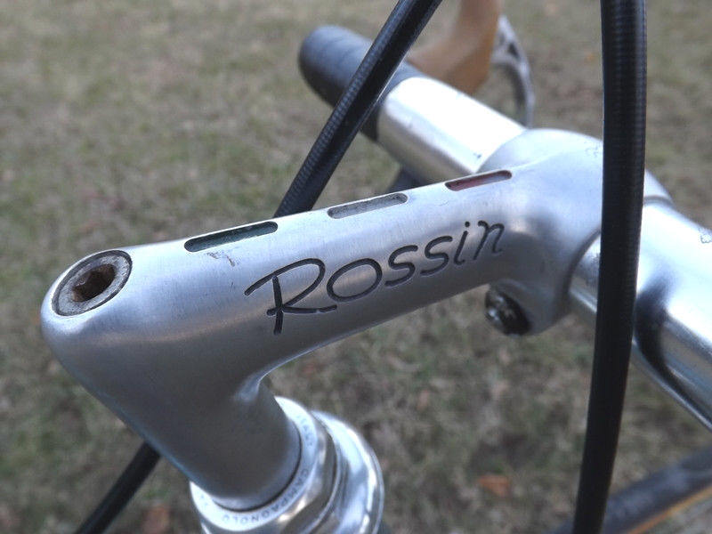 Marco Borri notes that the “rear derailleur is marked patent 76, while crank set arms are marked digit 5 in a diamond. The most intriguing detail are the head badge and seat tube stickers showing Rossin first generation logo….later on Rossin was sued by another company due to trade mark question of that R logo, consequently he was forced to modify it in the following years.”