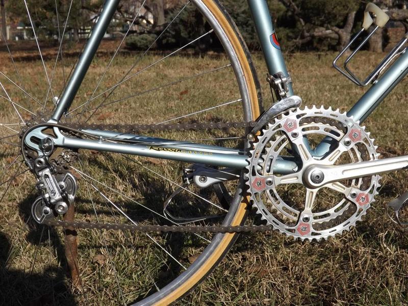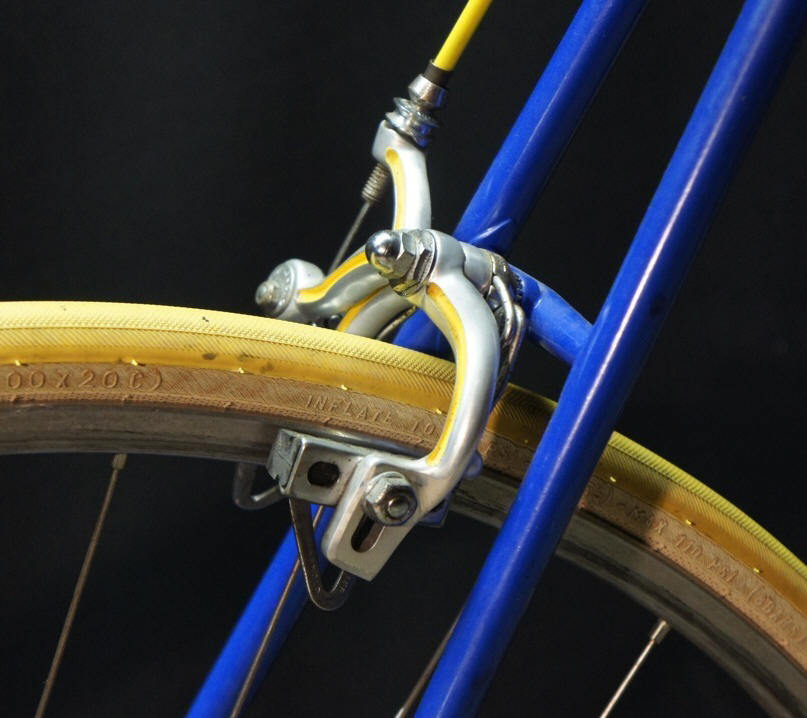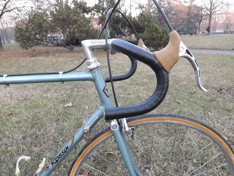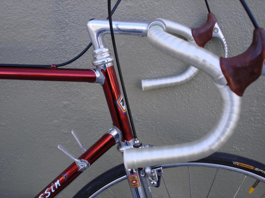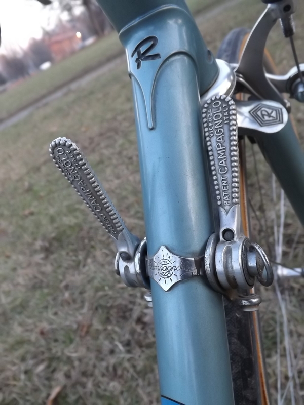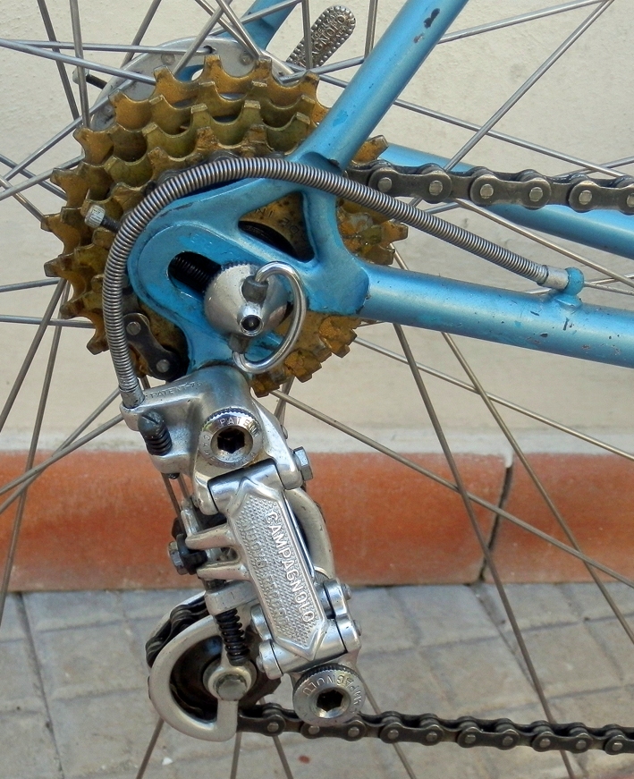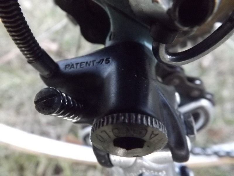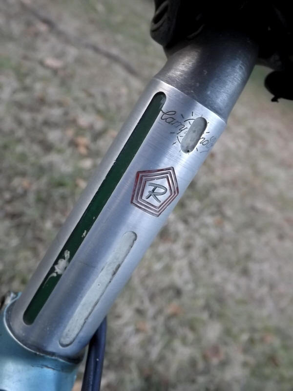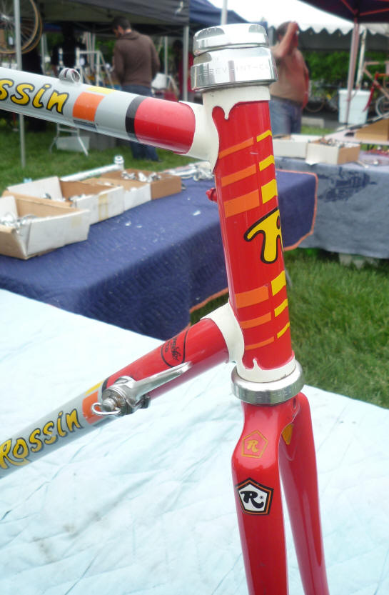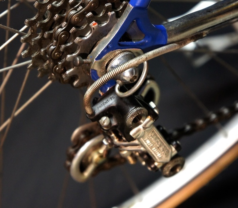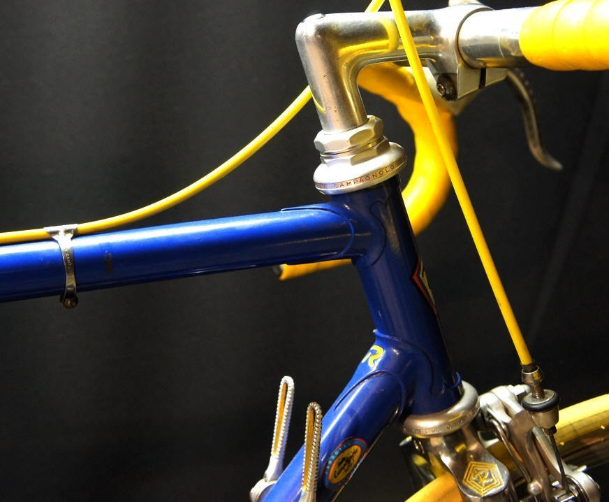 Marco Borri notes that the “rear derailleur is marked patent 76, while crank set arms are marked digit 5 in a diamond. The most intriguing detail are the head badge and seat tube stickers showing Rossin first generation logo….later on Rossin was sued by another company due to trade mark question of that R logo, consequently he was forced to modify it in the following years.”