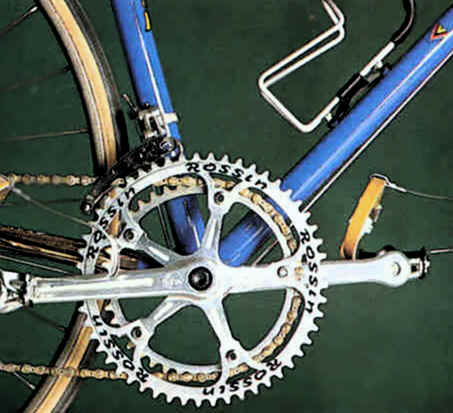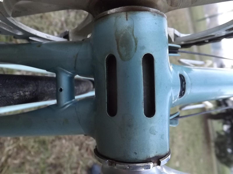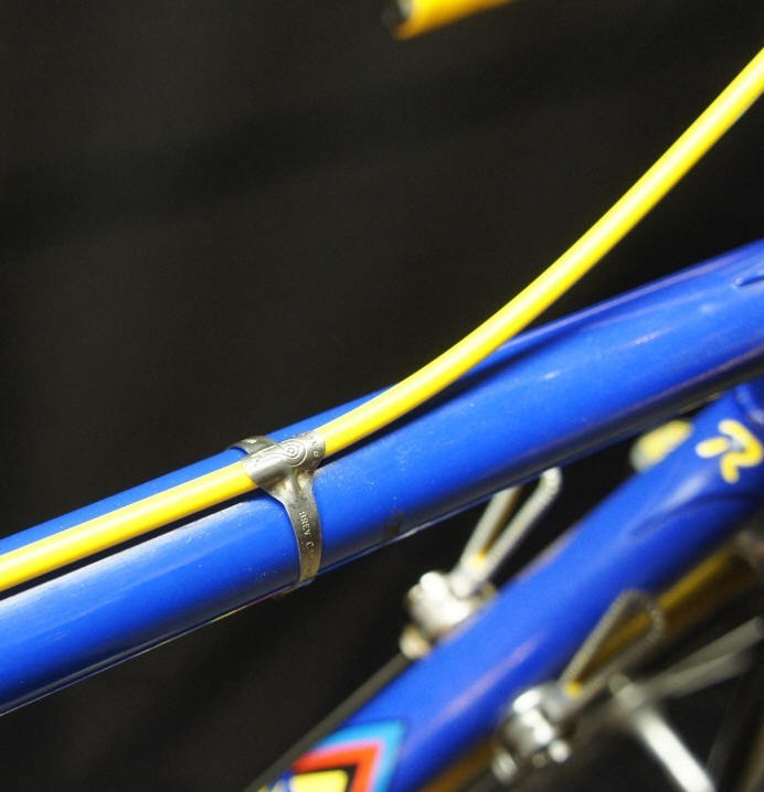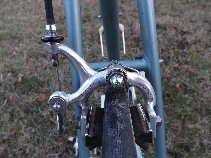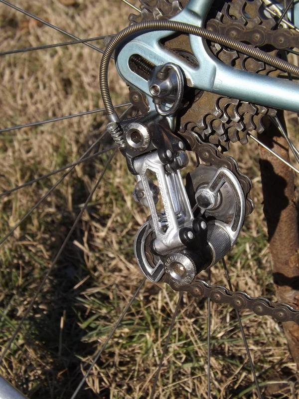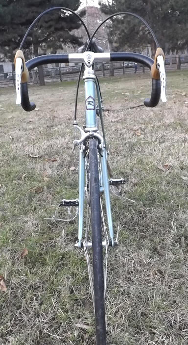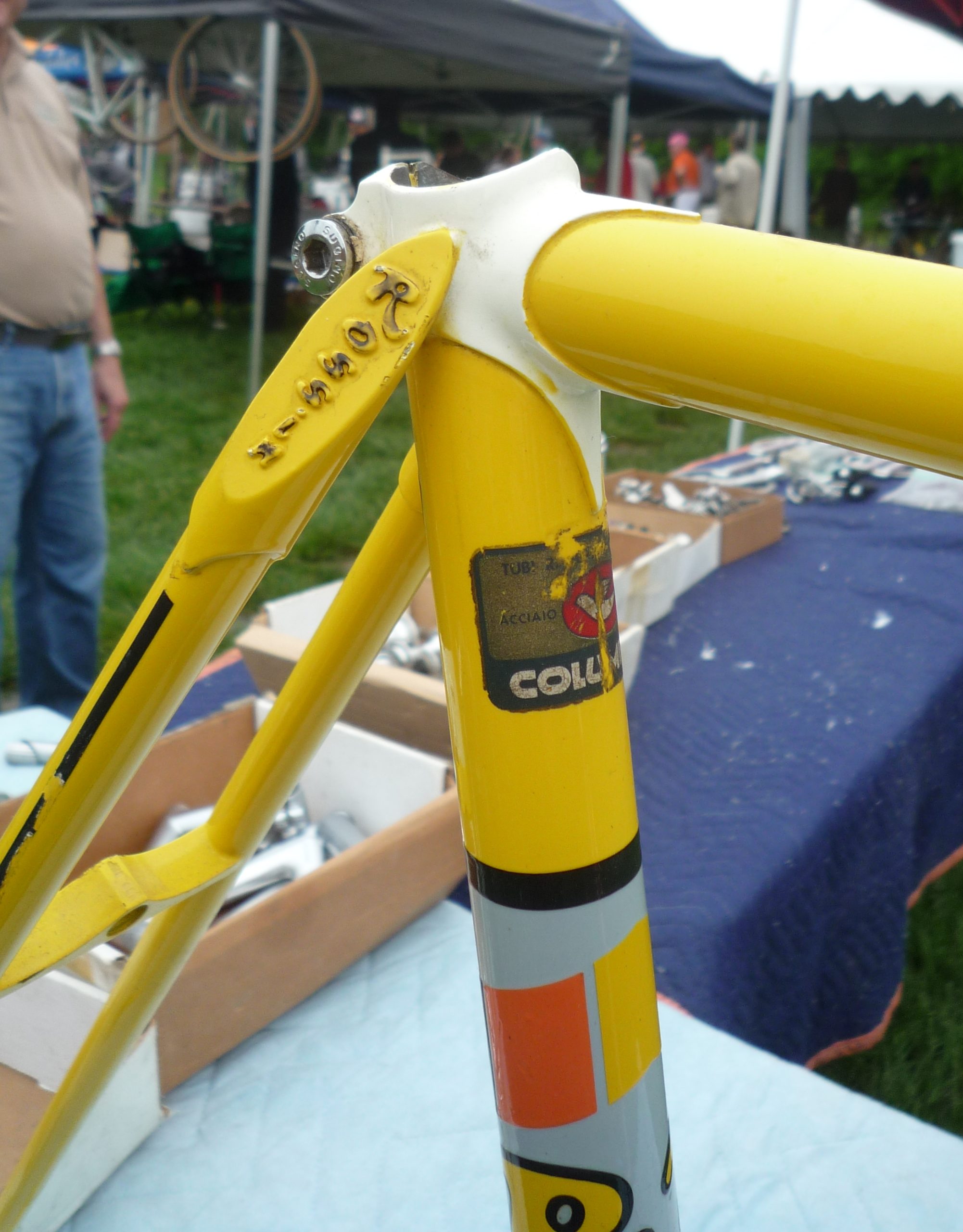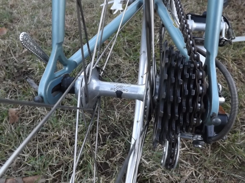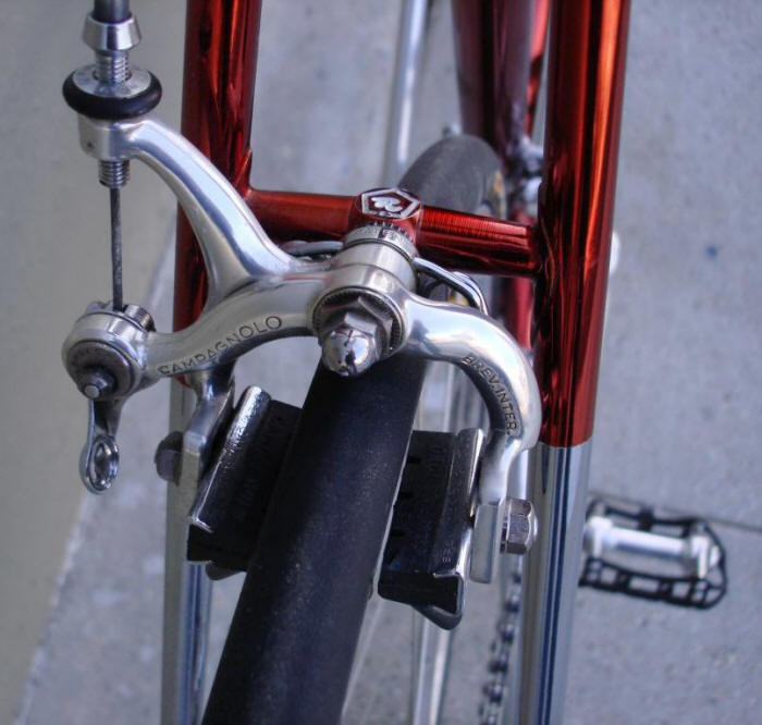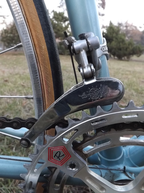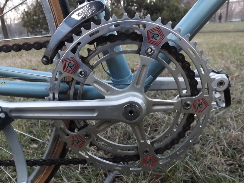 Marco Borri notes that the “rear derailleur is marked patent 76, while crank set arms are marked digit 5 in a diamond. The most intriguing detail are the head badge and seat tube stickers showing Rossin first generation logo….later on Rossin was sued by another company due to trade mark question of that R logo, consequently he was forced to modify it in the following years.”