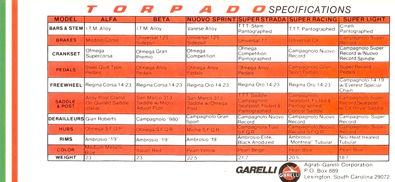 Torpado was family owned until the early 1980s when Agrati-Garelli first bought 49% and later completely bought out the Torresini family. Shortly thereafter, around 1987, bicycle production was ceased. In the 1970’s & 80’s, the Agrati-Garelli Corp. in South Carolina (along with Batavus) imported these bikes into the USA.