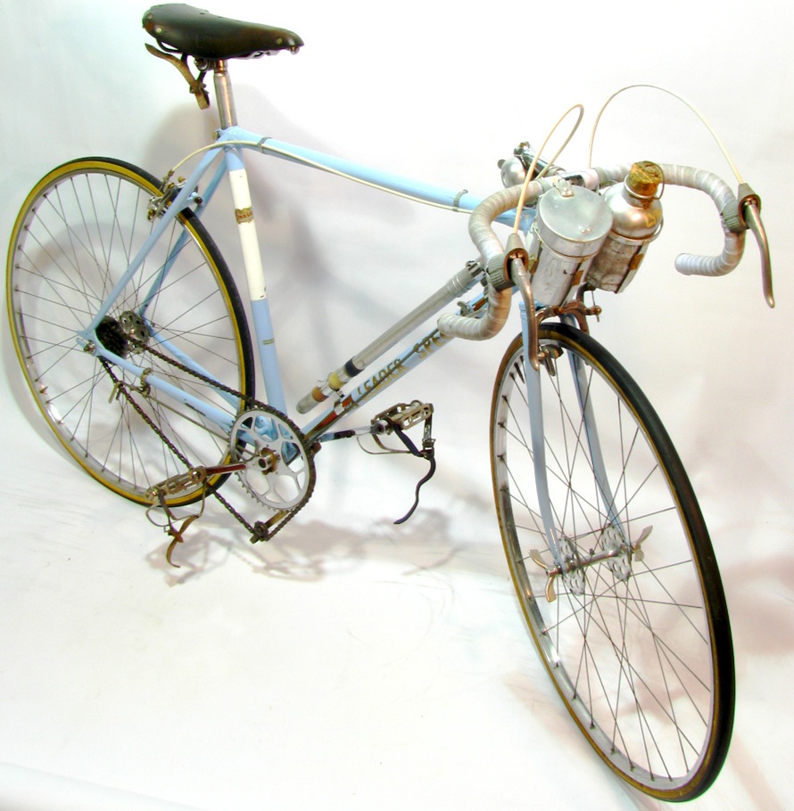 Pratney is seen here on his Leader, wearing a Leader Cycles jersey. Notice the very straight forks and tightly fitting rear wheel, circa 1929.