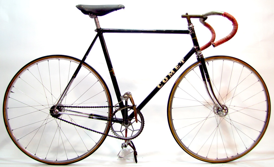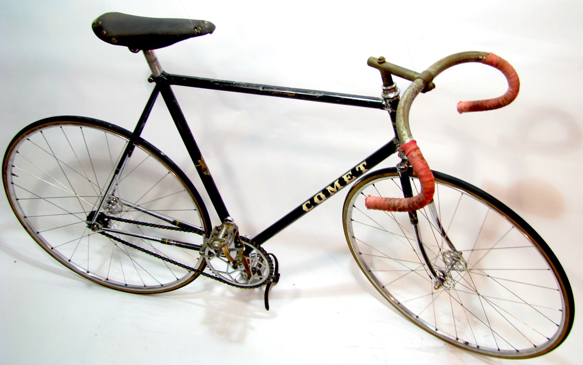 Comet racing frames were, although not pretty in the English lightweight sense, light and robust more in keeping with French racing bike design. Signatures are the half wrap seat stay (with a few file marks), Simplex rear drop outs on nearly all rear derailleur bikes during the 1950’s,serial numbers on the rear seat cluster, usually three to four digits.