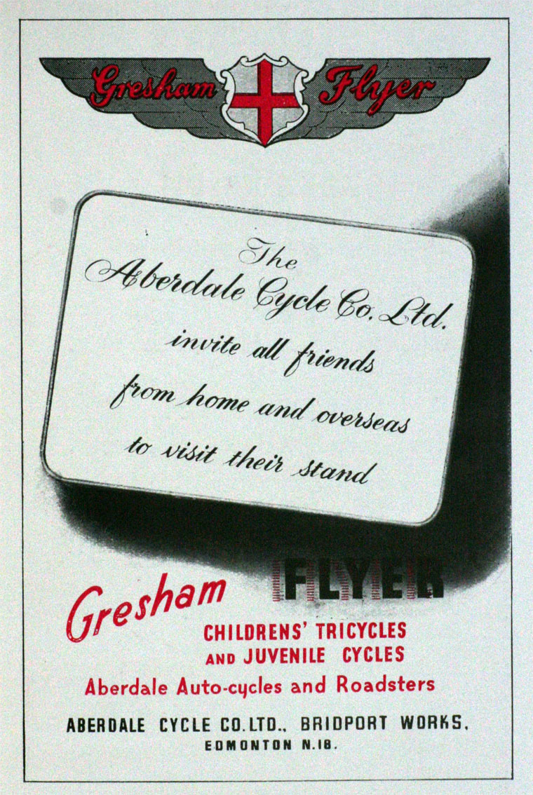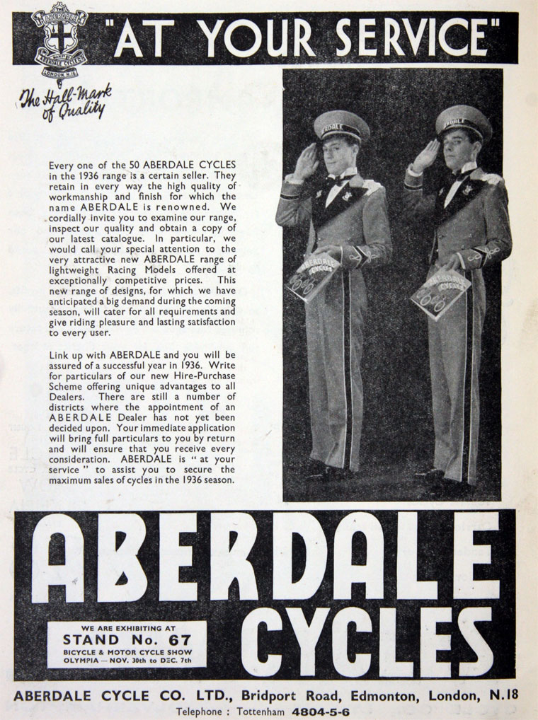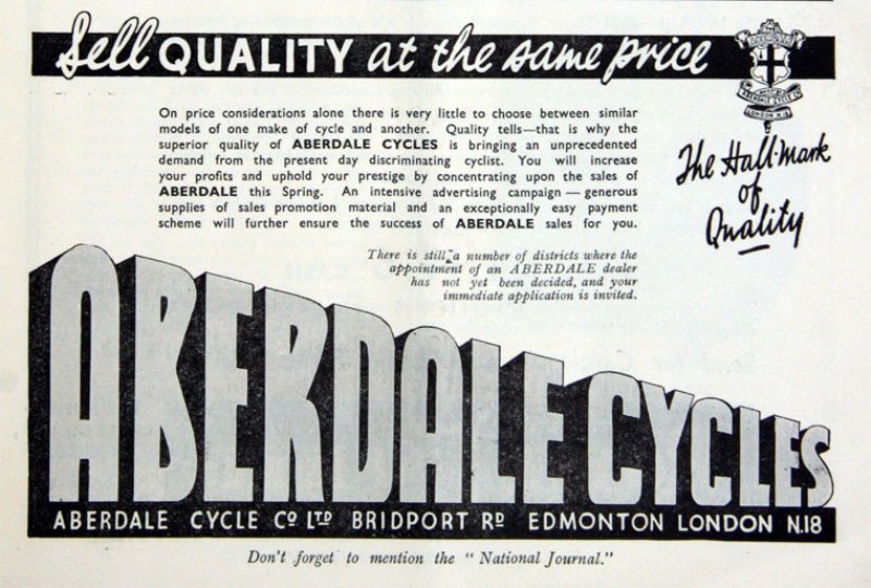By 1943 Aberdale Cycle Co was part of Raleigh Cycle Co. By 1956 Aberdale was one of Tube Investments cycle brands. Up to 1976 Aberdale Cycle Co was a subsidiary of Raleigh.