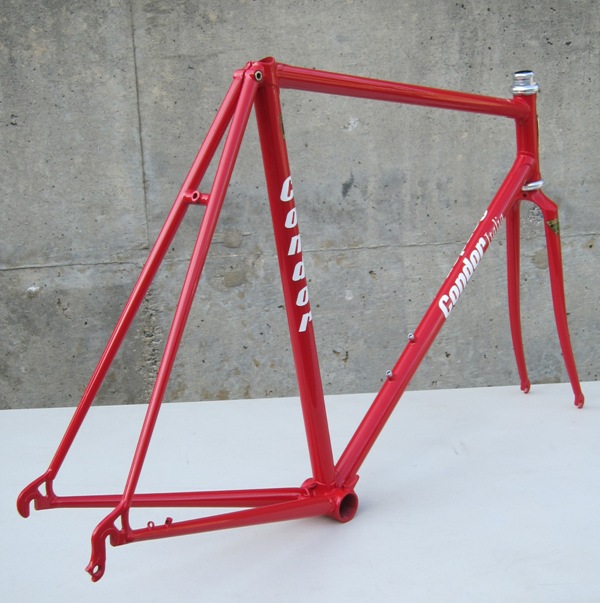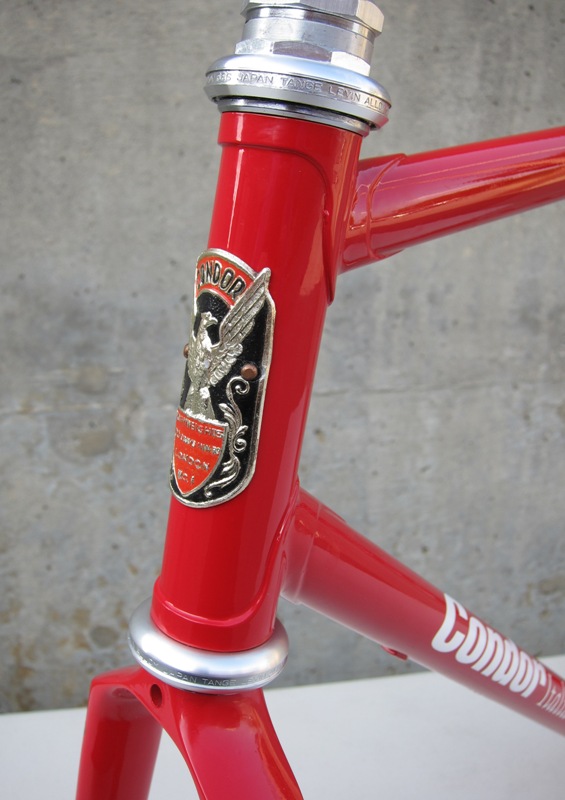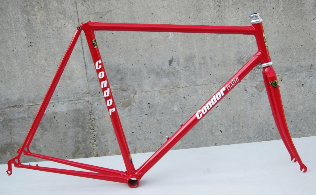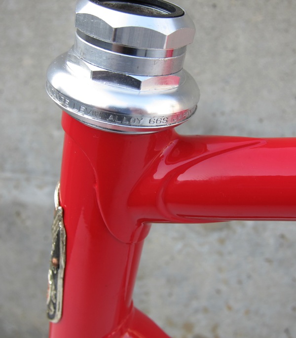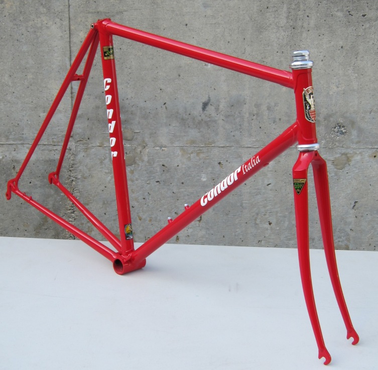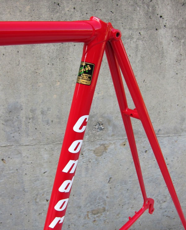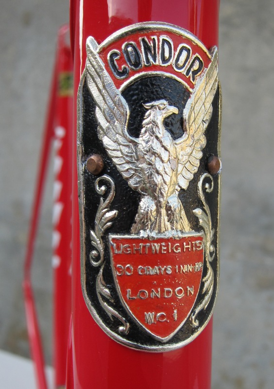 “It is in the lug work that the strength and appearance of a frame chiefly lies; and, too, it is mostly the lug work which dictates the price of each frame. Condor Cycles fit eight different lug sets, only two of which – the Nervex Professional and Italia Standard – are produced out side their own workshop. Their own half dozen sets are hand cut, from plain lugs to combine maximum lightness with as large a brazing area as possible thus ensuring a stronger and more rigid joint – Mr. Hurlow has been responsible for these designs. All frames are completed with T. D. Cross head sets, Bayliss Wiley Featherweight bottom bracket sets and alloy seat pillar. Finishes include any colour enamel, lustre or flamboyant, with contrasting seat panel and lug lining. The W.B.H. Italia, by the way, has an enamel finish only, without lug fining, with 6 in. chrome front and rear ends, dual crown and head lugs Italian style seat panel.”