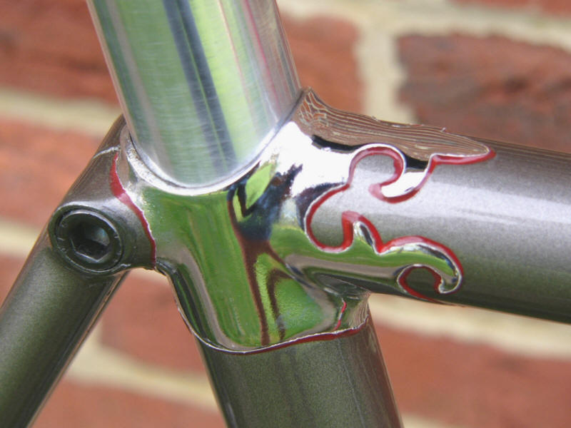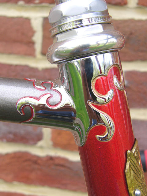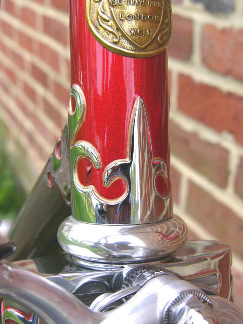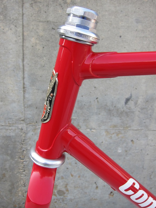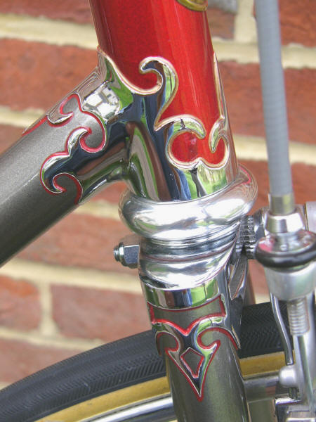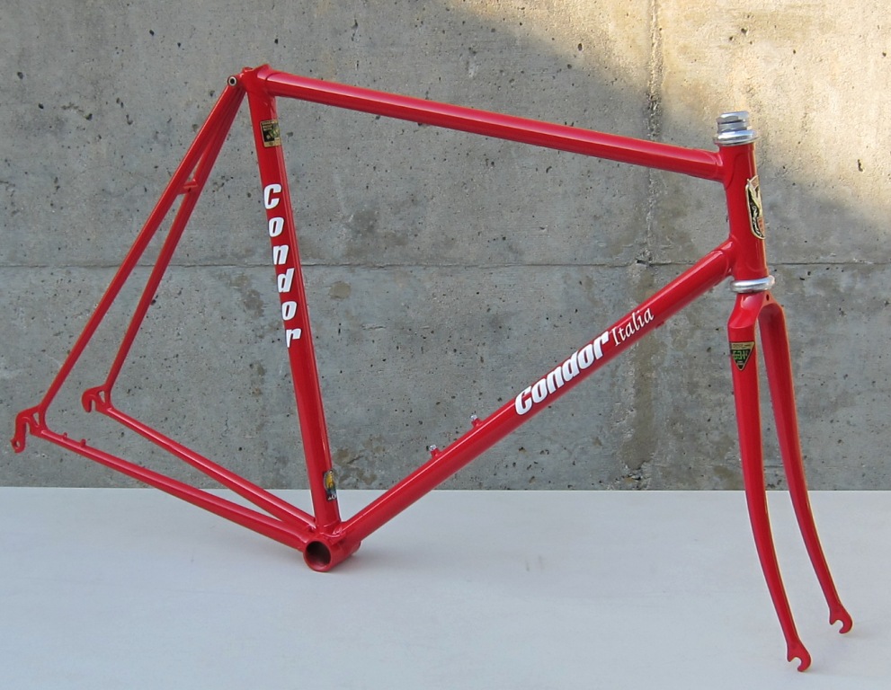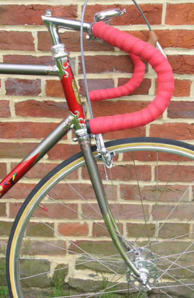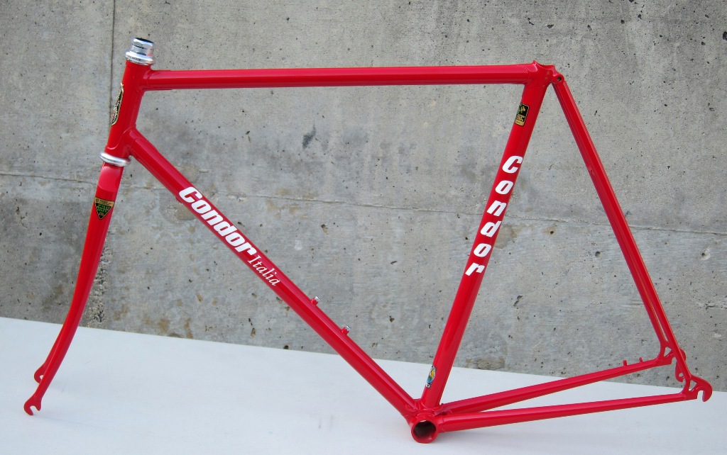 “It is in the lug work that the strength and appearance of a frame chiefly lies; and, too, it is mostly the lug work which dictates the price of each frame. Condor Cycles fit eight different lug sets, only two of which – the Nervex Professional and Italia Standard – are produced out side their own workshop. Their own half dozen sets are hand cut, from plain lugs to combine maximum lightness with as large a brazing area as possible thus ensuring a stronger and more rigid joint – Mr. Hurlow has been responsible for these designs. All frames are completed with T. D. Cross head sets, Bayliss Wiley Featherweight bottom bracket sets and alloy seat pillar. Finishes include any colour enamel, lustre or flamboyant, with contrasting seat panel and lug lining. The W.B.H. Italia, by the way, has an enamel finish only, without lug fining, with 6 in. chrome front and rear ends, dual crown and head lugs Italian style seat panel.”