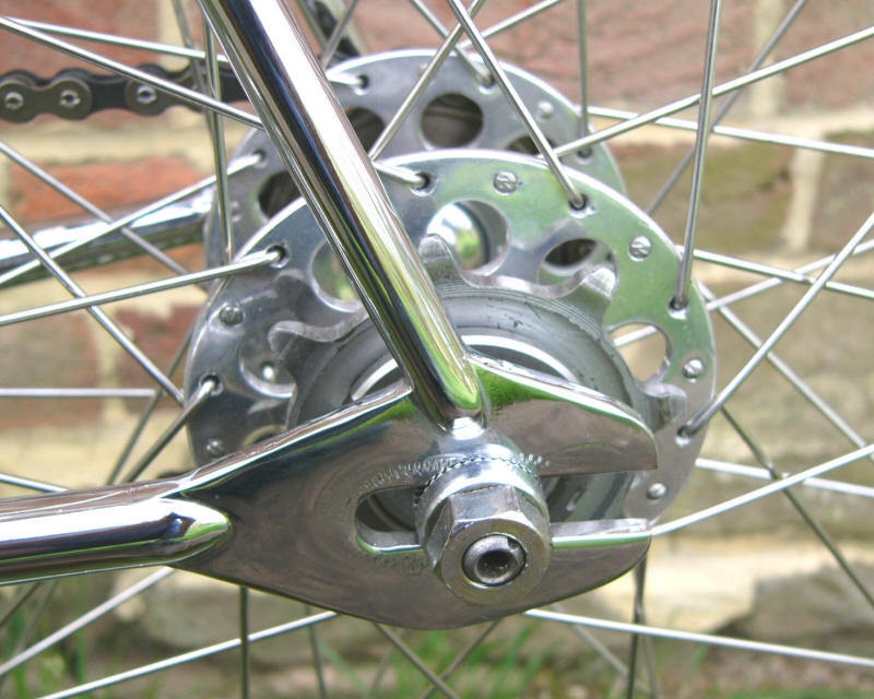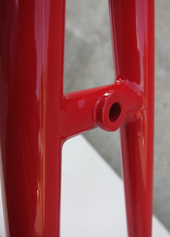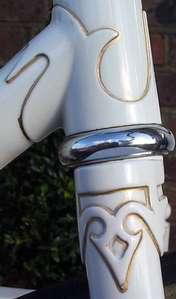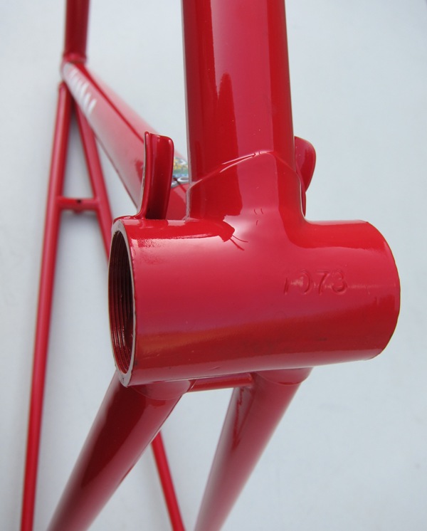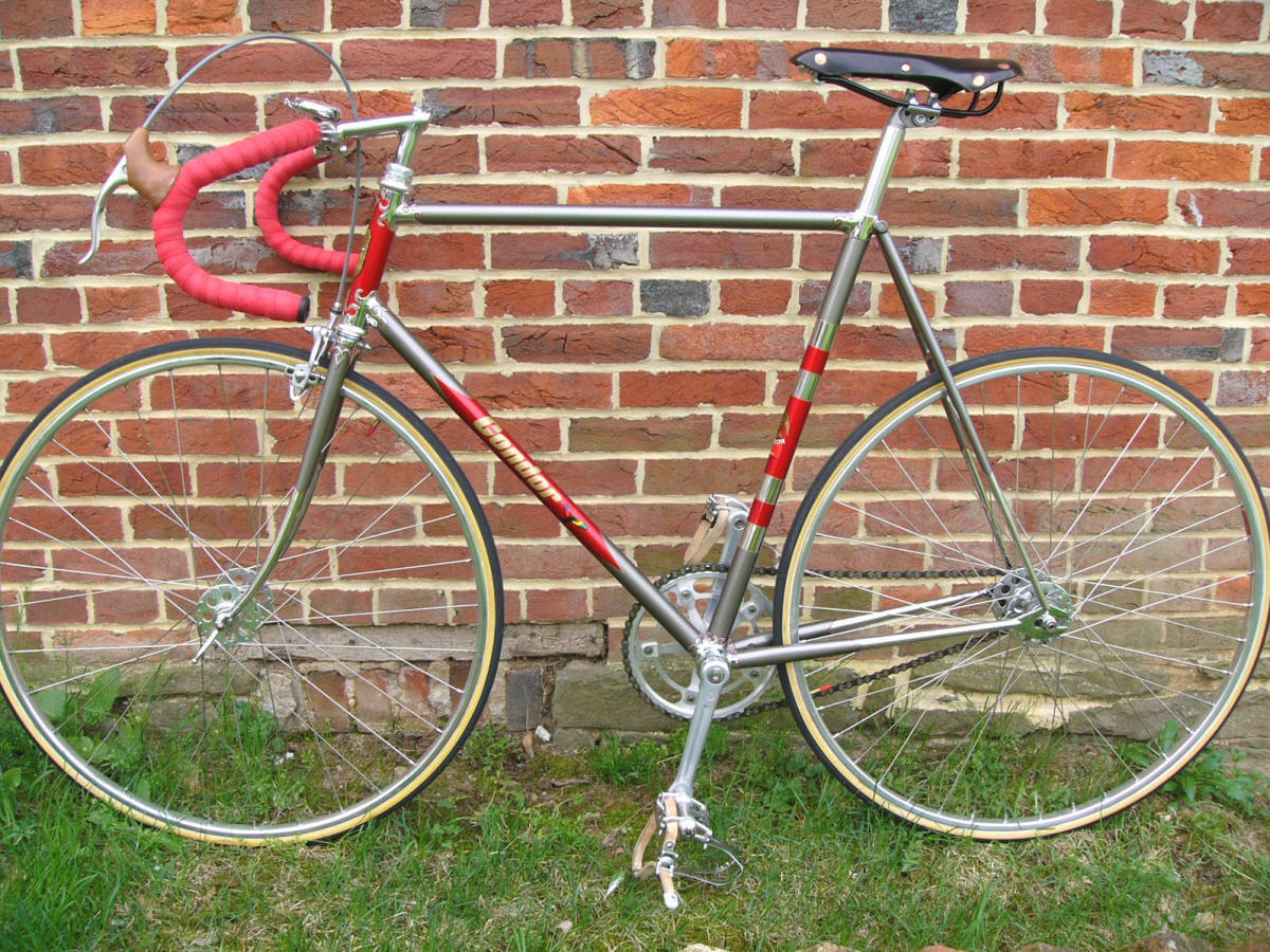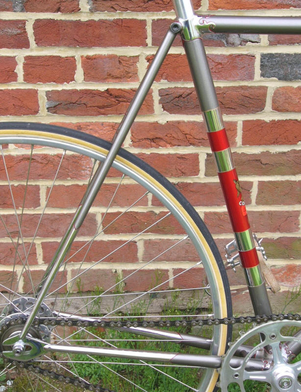 “The 22 in. path model has 73′ parallel angles, a 22 1/2 in. top tube, .short rigid rear triangle with 17 in. x 1 in. round chain stays and 1/2 in. wrap-over seat stays; long path ends give maximum scope for chain adjustment. Front forks are round section with a 1 3/4 in. gradual rake. Bottom bracket height with 27in. wheels is 11 in. and, unless specified, there is no mudguard clearance, brake fitting facilities or any brazed-on items. Internal stiffening liners can be tilted to both….”