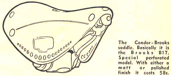 “The Condor-Brooks saddle, a recently instituted item, is already in wide demand. Its basis is the Brooks B17 Special perforated model……….. An appreciable amount of leather is removed from the back end, more from the peak. Larger rivets are used to ensure that the seat is still firmly gripped. With either a polished or matte finish the new design, comfortable in use and pleasing to the eye, costs 58s. inclusive of a plastic under-seat protector.”