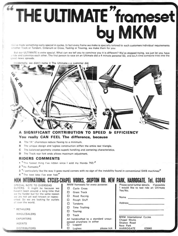 “I own a 1979 MKM Dominator which I ordered from MKM in August 1979. My frame was not delivered as the company had gone bust and my frameset and another were collected by my mother in October (I think it was) 1979 from Kirby Stephen from Mr Crabtree. I have read elsewhere of claims to have got the last frame from MKM but mine was definitely one of the last.”