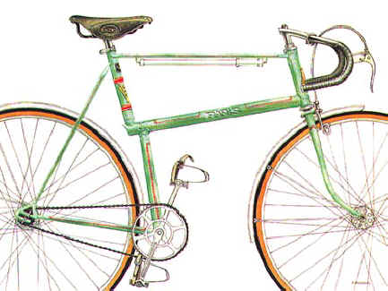“The Galibier is an exciting cantilever design. It uses larger dimension tubes, with twin top tubes to provide greater strength. The overall advantage is a shorter wheel-base, 37” is possible, giving a stiffer ride. Harry Rensch pioneered bronze welding and lug lamination, and the Galibier model is a bilaminated lugless frame that “exhibits” excellent aerodynamics