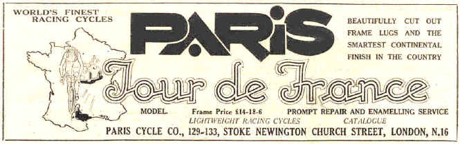 ” …….not all models built by Paris were of the Galibier style (it was treated with great suspicion by most) The “Tour de France” and the lower priced “Professional” were their mainstays the former having elaborate ģbilaminatedē lugs which were not truly lugs as the frames were welded but were very ornate. These, combined with a paint finish, unique in those days, where one colour was “faded” through several others to become something different (for example bright red faded through silver to blue or yellow), was what made them popular, as did their association with the League. The British League of Racing Cyclists brought “continental massed start racing” to the public roads. Paris sponsored a successful racing team in the late 1940đs and a win in the six day Brighton to Glasgow race brought a high demand for their frames.”