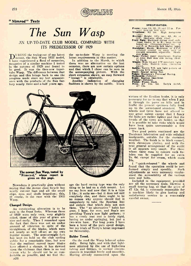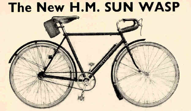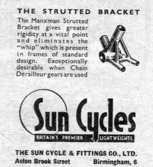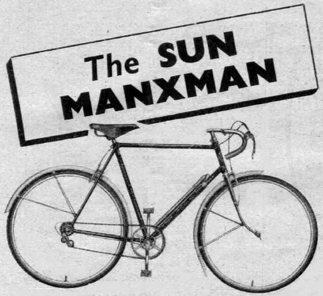 “Sun first began the production of cycle parts in 1885 and by 1906 were producing a range of machines. Their main period of fame was from the middle 20s through to the 50s. The Wasp was a popular almost budget priced lightweigHt aimed at the Clubman. Tandems represented quite a large part of their output. In 1940 they launched a new version of the Manx TT model which did not enter manufacture until 1945/6. It featured a seat tube joining the down tube about 2/3s the way down with a couple of extra struts from the bottom bracket to the seat tube. All this was done to make a short wheelbase which was seen as desirable then.”