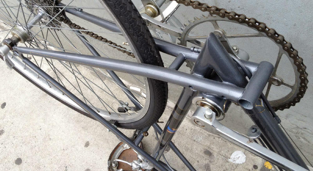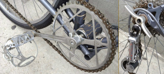– The “Silverlight” an unorthodox design as illustrated below. The Silverlight featured smaller than normal tubes (1″ down & seat tube, 7/8″ top tubes.) Note the design that in which the seat and down tube travel below and cradle the bottom bracket shell. Also notice the extremely small diameter chain stays…