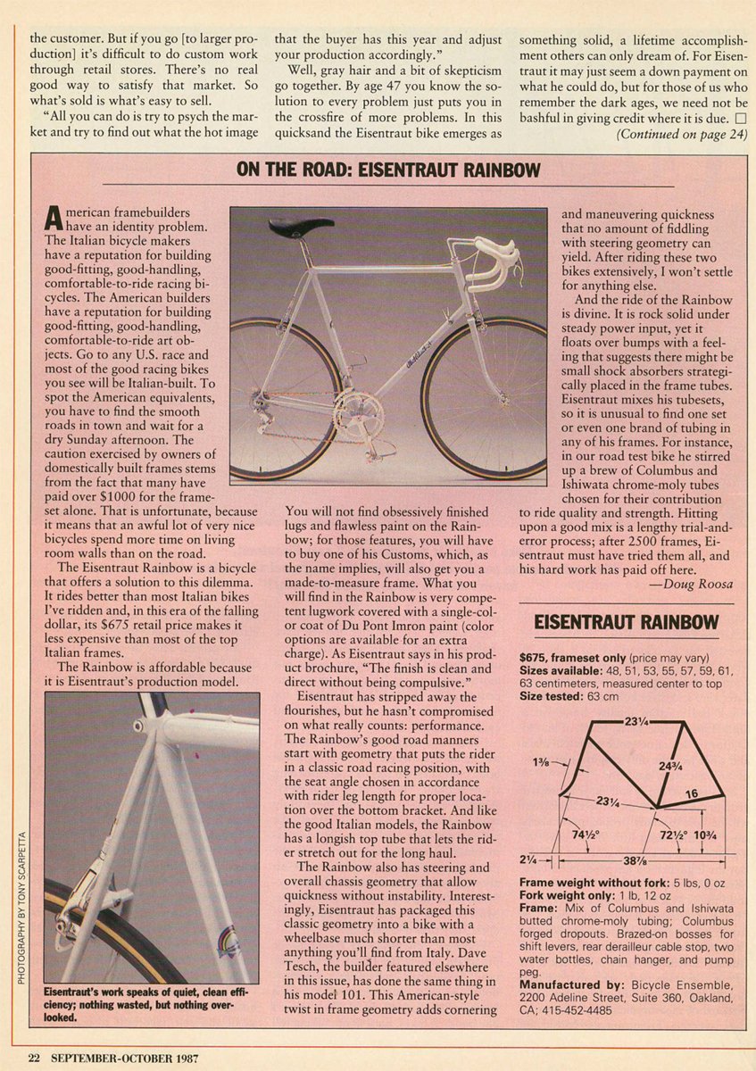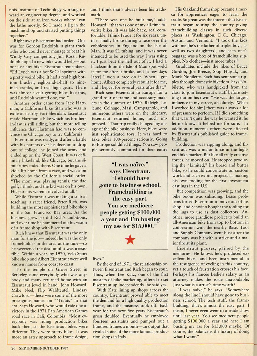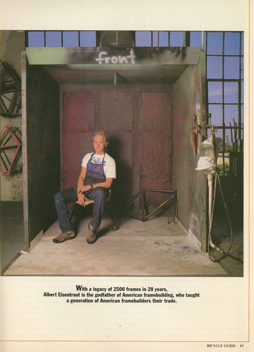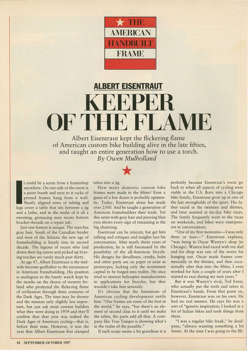 Albert Eisentraut acquired an appreciation of hand built bicycles at the elbow of legendary Paramount maker Oscar Wastyn in Chicago, and Albert, in many ways, is the dean of modern (post Korean War) USA custom frame builders. His frames, especially the famous “Model A” frames of the 1960s and 70s, had a special sculptural aesthetic and unorthodoxy in their shaping. This set Eisentraut bicycles apart from the European mimicry that influenced other builders at that time. Albert Eisentraut grew up with cycling in his blood.