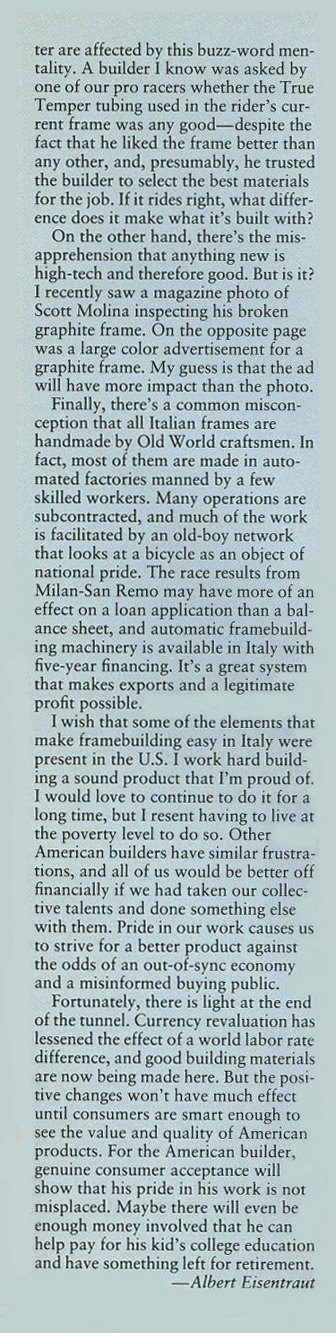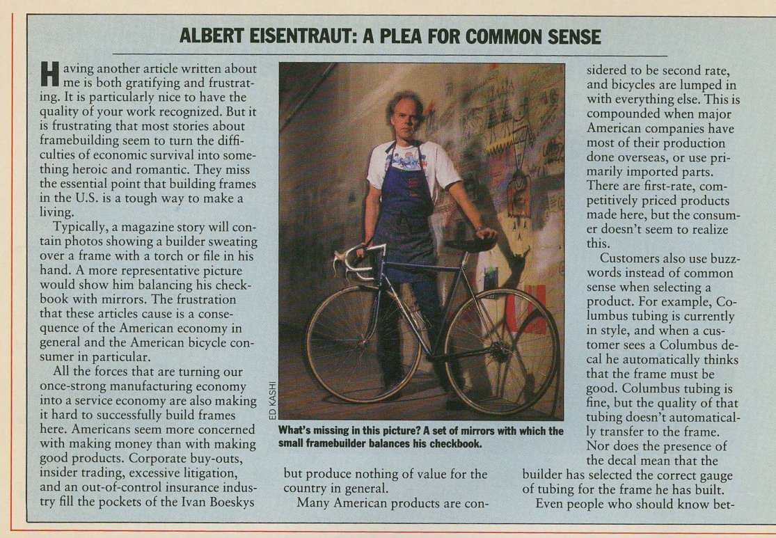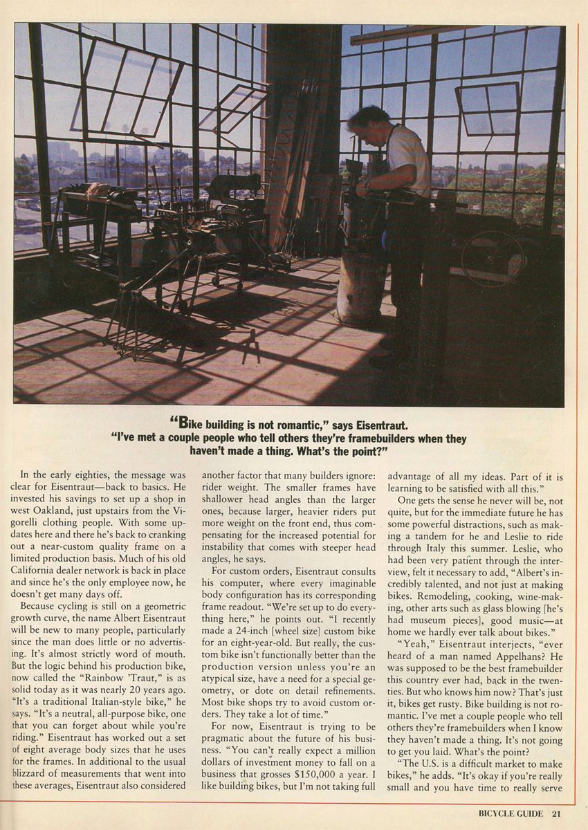 Albert has also taught dozens his craft; his notable students include Bruce Gordon, Joe Breeze, Skip Hujsak, Mark Nobilette, and Bill Stevenson – making Eisentraut the American godfather of modern day frame building. Albert commented, “The only constant in my life is the forever changing bicycle business.”