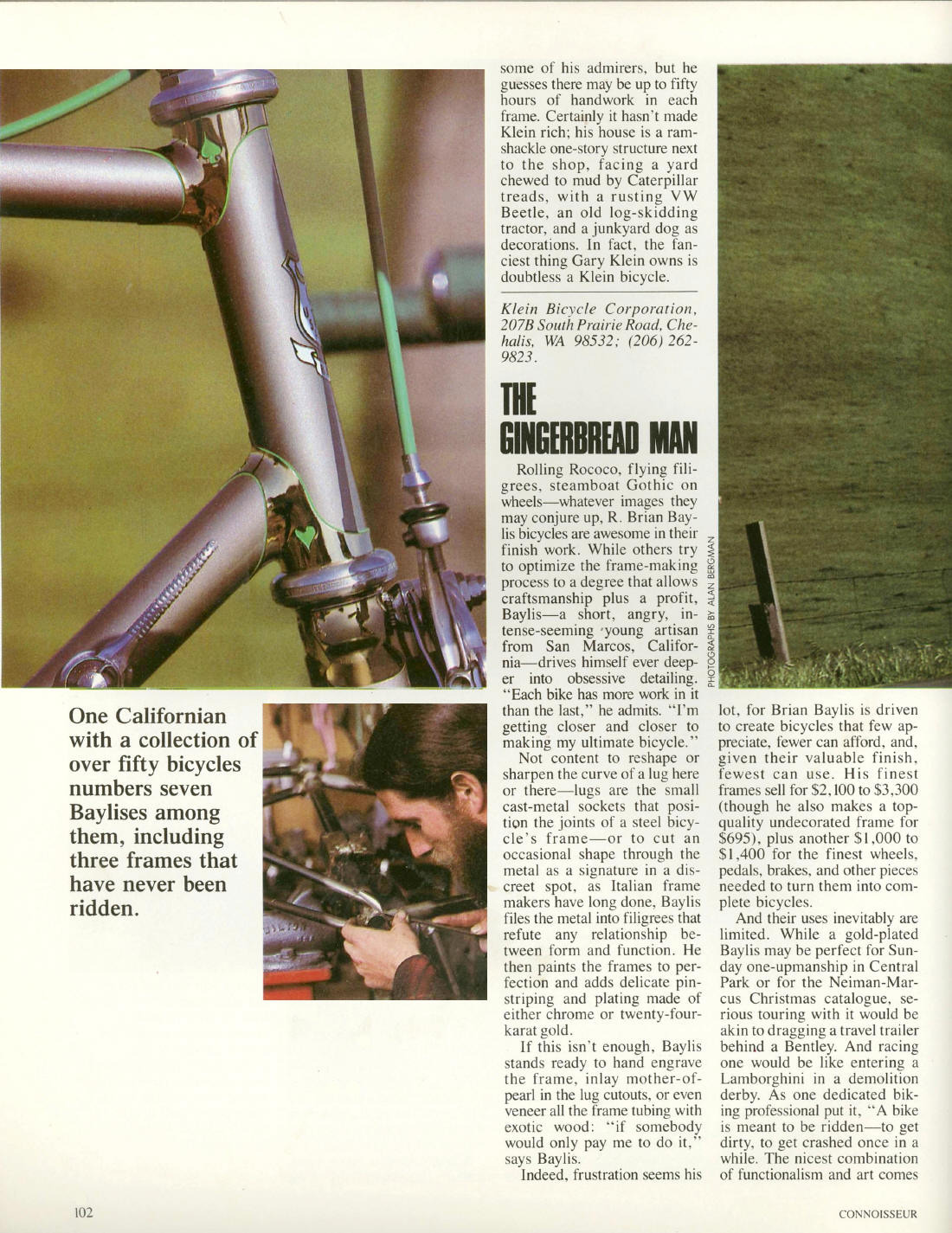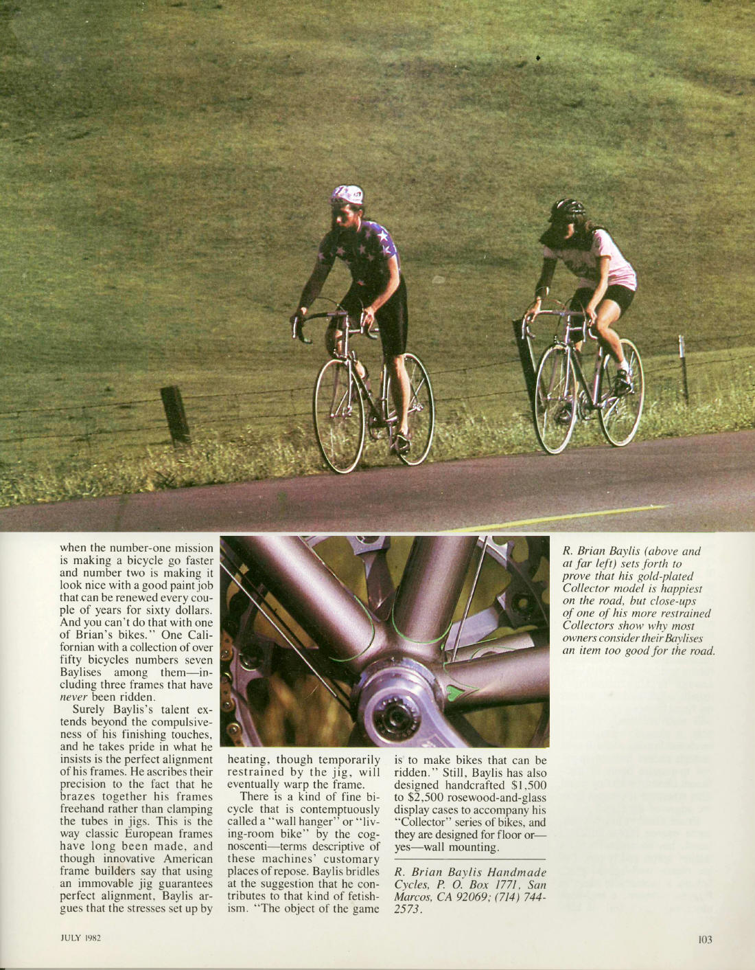 Brian Baylis witnessed many changes in the bicycle business. Despite fad after fad, he maintained a refined, traditional direction and his work has always represented the highest standard available. Brian began his frame building career with the startup of Masi USA in 1973.