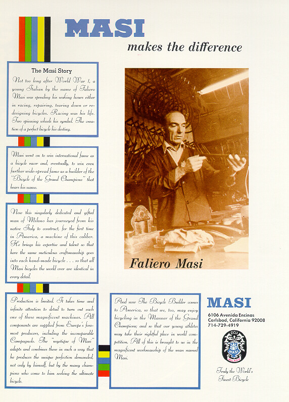A high quality bicycle production was operated in Carlsbad, California under the supervision of the maestro “tailor” of champions, Faliero Masi. Italian production continued under his son, Alberto. The USA company in turn fostered many fine USA builders and artisans. Mario Confente (now deceased), Brian Baylis, Jim Cunningham, Mike Howard, Gian Simonetti, Joe Starck and David Tesch are part of the heritage of Masi USA.