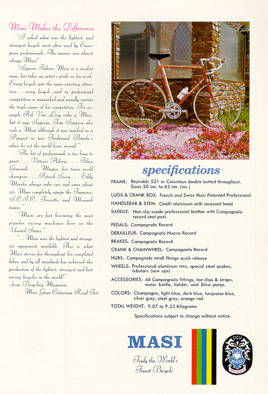 The ownership and manufacture of the Masi cycles has changed over the years and a new line of contemporary bicycles is currently being manufactured “off shore.” (see link below). The early Masi bicycles made in the start-up era have developed a strong following amongst vintage buffs.