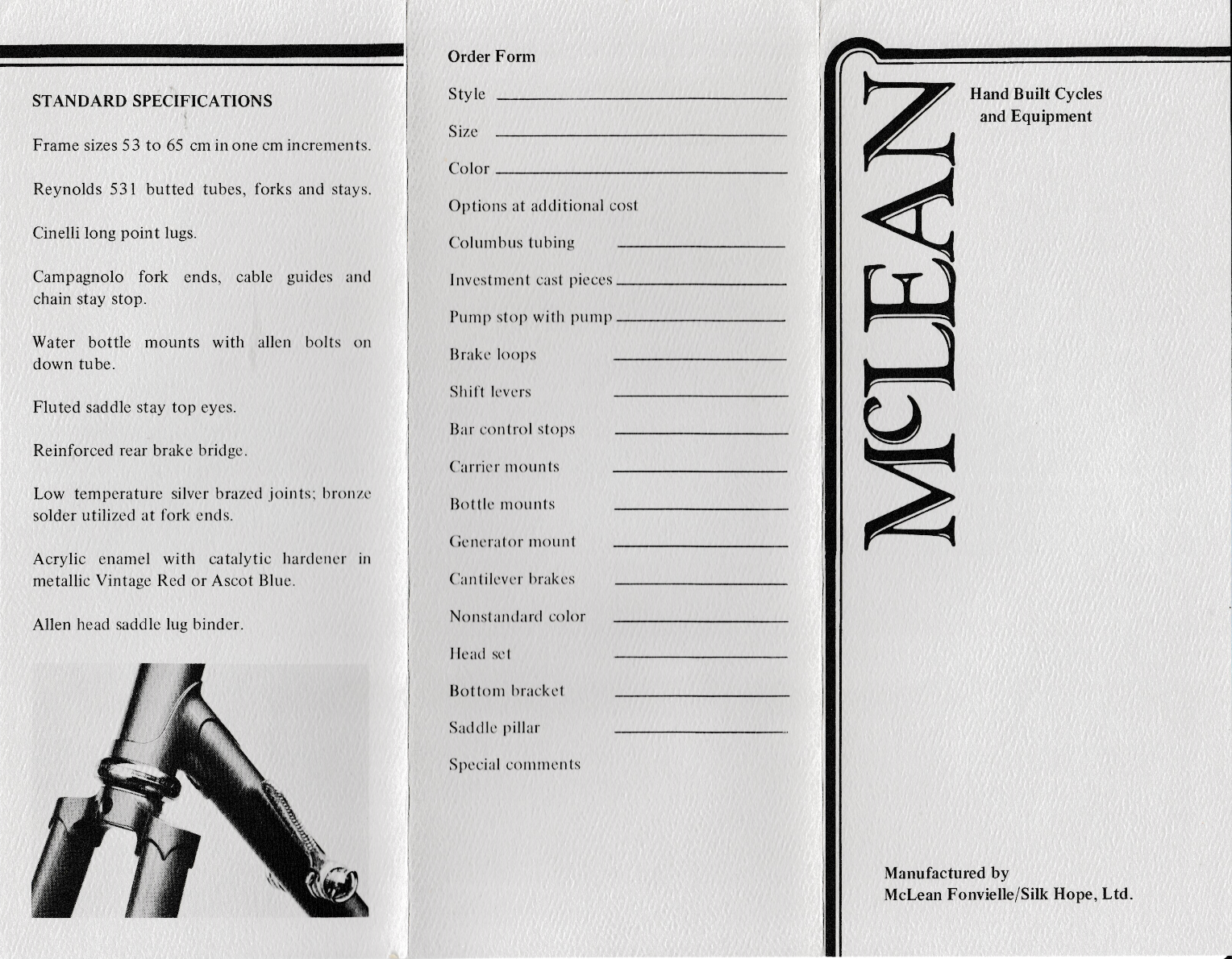 After receiving requests from customers for a less expensive model, around 1978 he offered the McLean brand at a lower cost. The model Silk Hope would remain full custom, the model McLean more standardized. The workmanship was the same however.
