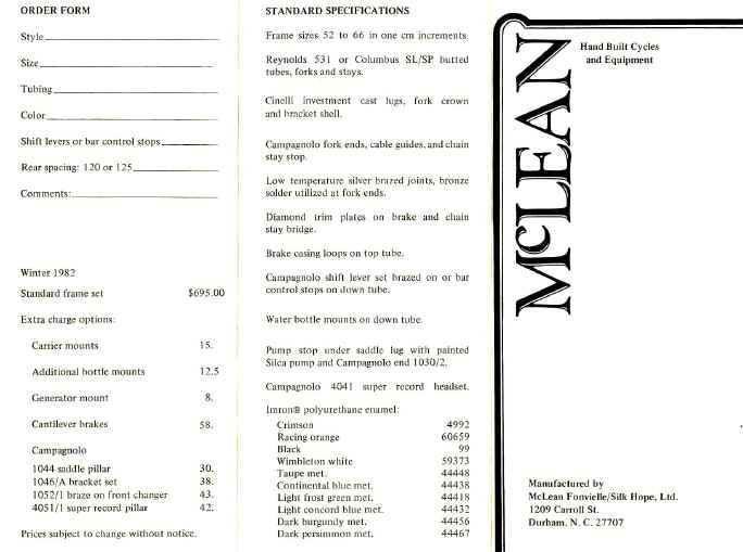 He died of an unforeseen heart failure in his basement while riding an exercise bike. McLean was a non smoker, a vegetarian & a fit person who only a year or so before his death had married Lanier. He was finally becoming well known after an 11 year career run at making frames. Toward the end, Cycle Imports in Cornish, Maine, had become an effective national sales outlet for the frames.