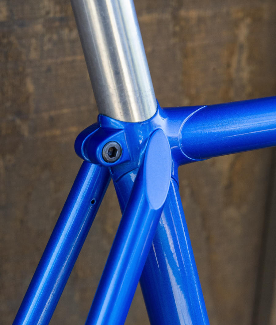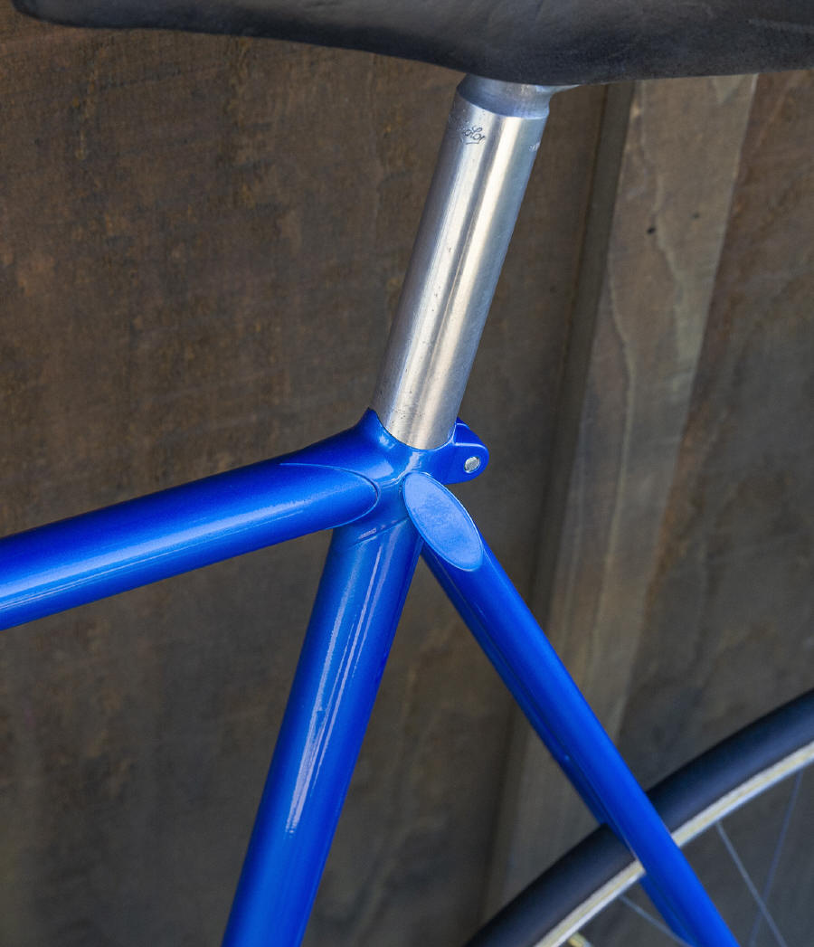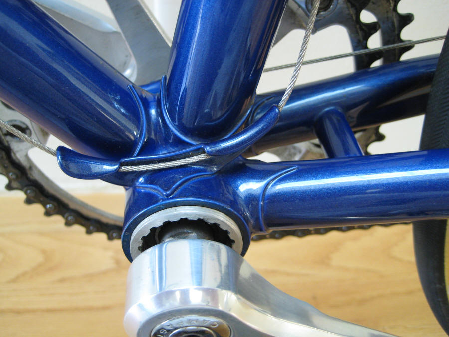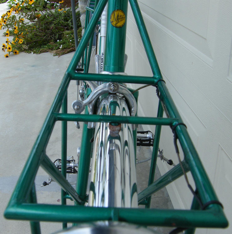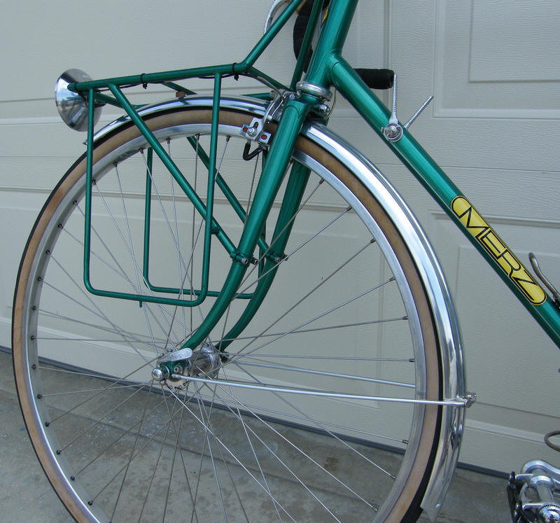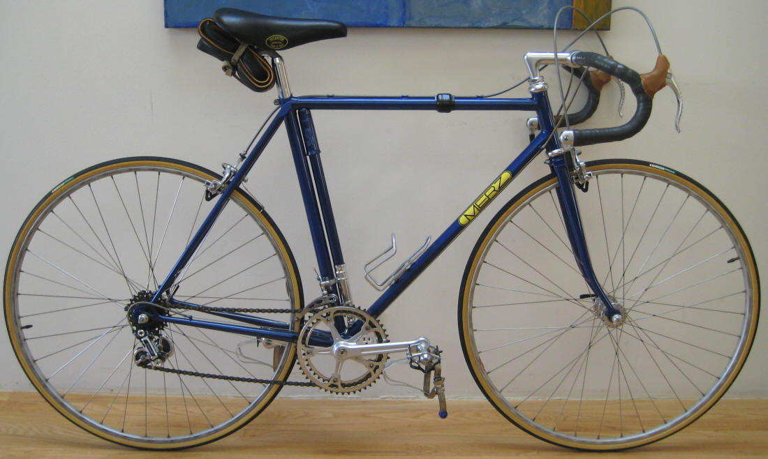 “Jim Merz built bike frames in Portland, OR from 1973 until late in 1982, then he shut down his shop and went to work for Specialized as a designer. Merz could build a track or ‘cross bike, and built superlative road racing bikes, but touring bikes were where he stood out. He made bikes with tubular steel racks–generally shorter and quicker steering than most other touring rigs of his time–and matching panniers also made in Portland.” “Jim started riding a Campagnolo equipped bike in 1964, just after high school. Jim worked as a machinist and taught himself frame building from his metalworking background. He opened his own shop at NW 21st and Everett. Over 400 frames were produced, using Columbus, Reynolds 531 and 753 tubing including two 753 frames (He was the first USA builder certified to use 753) for pro rider George Mount. Merz used BCM lugs and crowns, finished seat stays with flat tops a la Schwinn Paramount, and decorated the bikes with simple graphics and paint. His painter was Virginia Church.” “To this day, many Portland bikies consider Merz machines in high regard, even the best bikes ever made. Jim was a resident of Bainbridge Island, WA, working for the Browning company, until his recent return to Specialized as their “Master frame builder”.