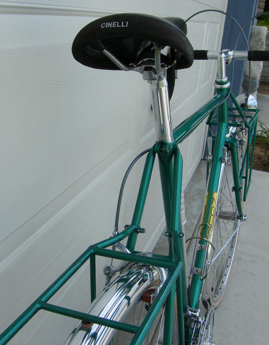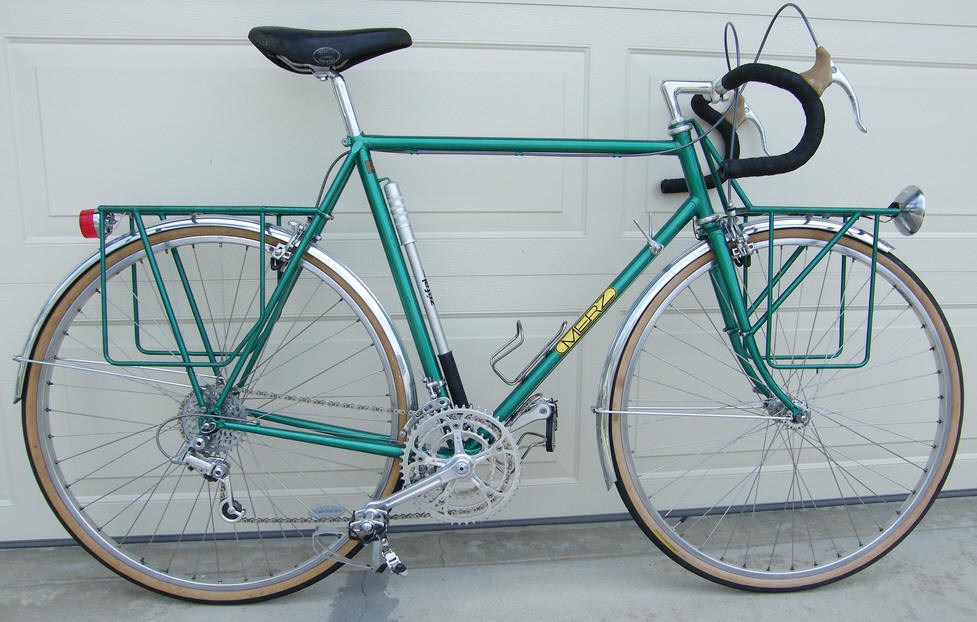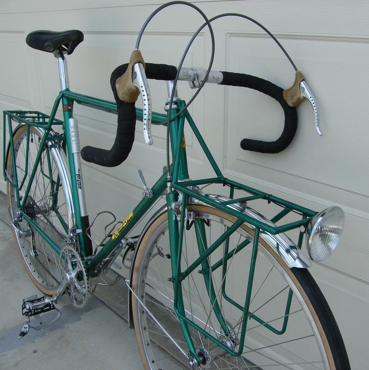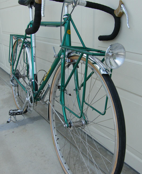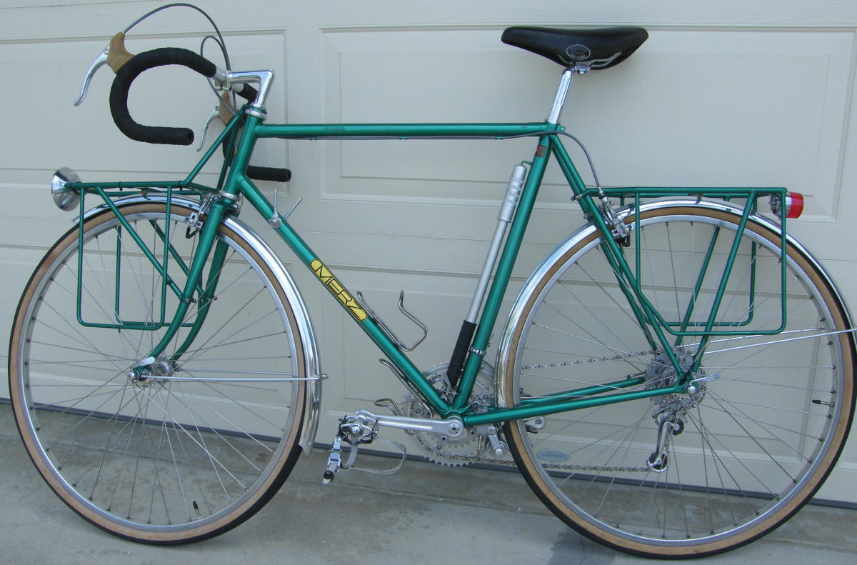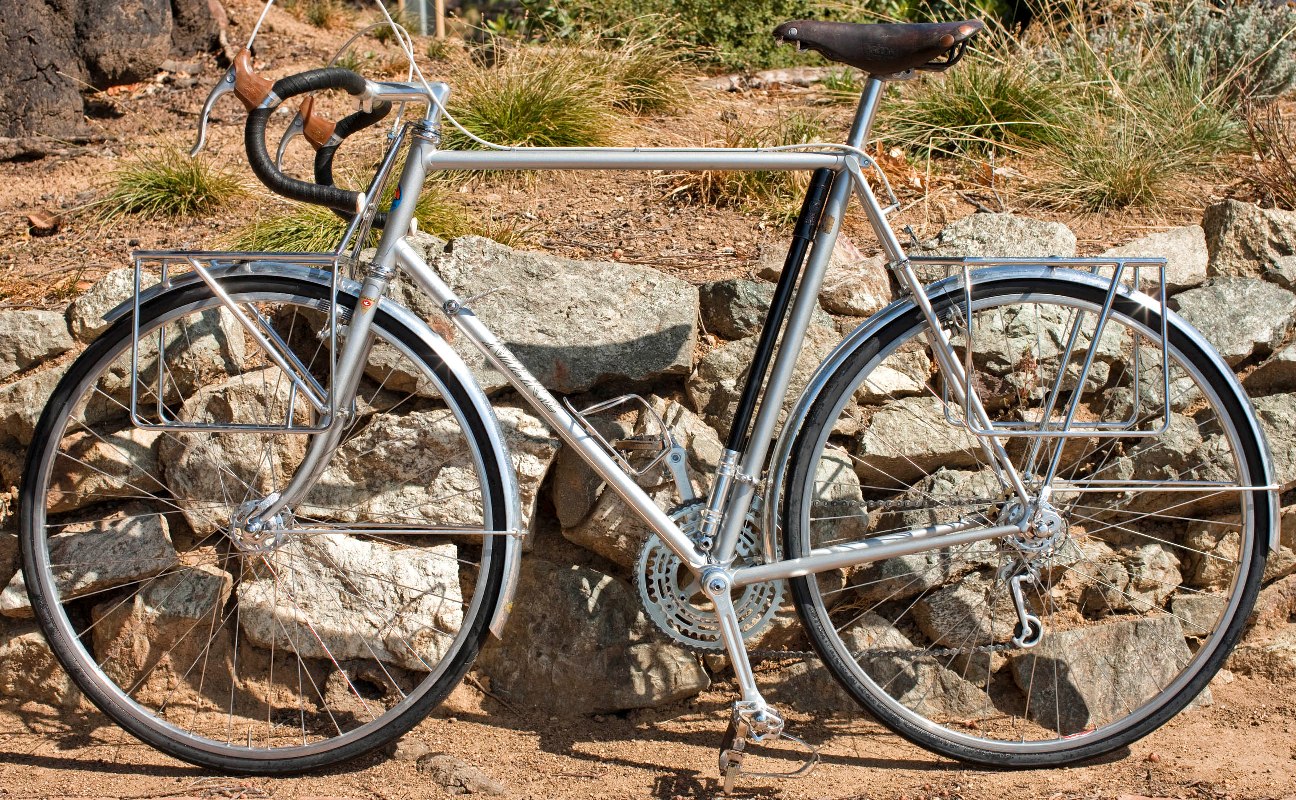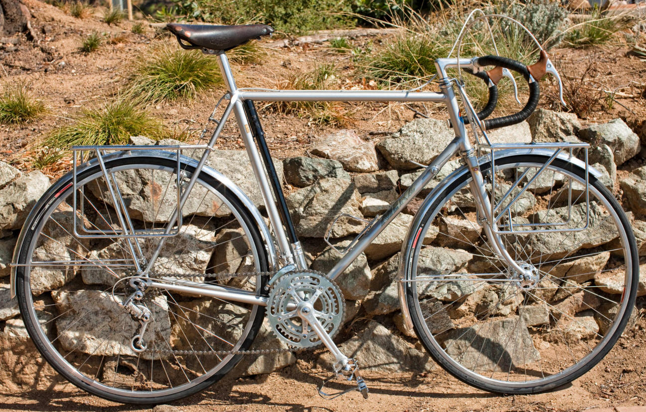 “…made in 1978…bought it back from the original owner, looks like he did not use it. The fenders were Bluemels and were brittle so I put some alloy fenders on. I also put new tires on, although it had the originals . The cage is also new. The racks were made by me, along with the 31 tooth front chainring. The wheels are 700c. Even he bar tape is original. The bike is my size!”