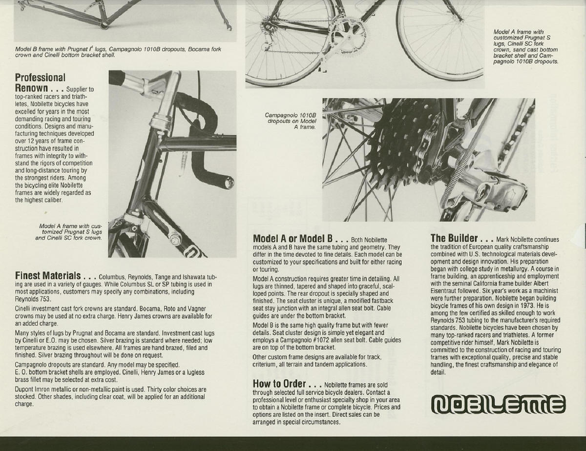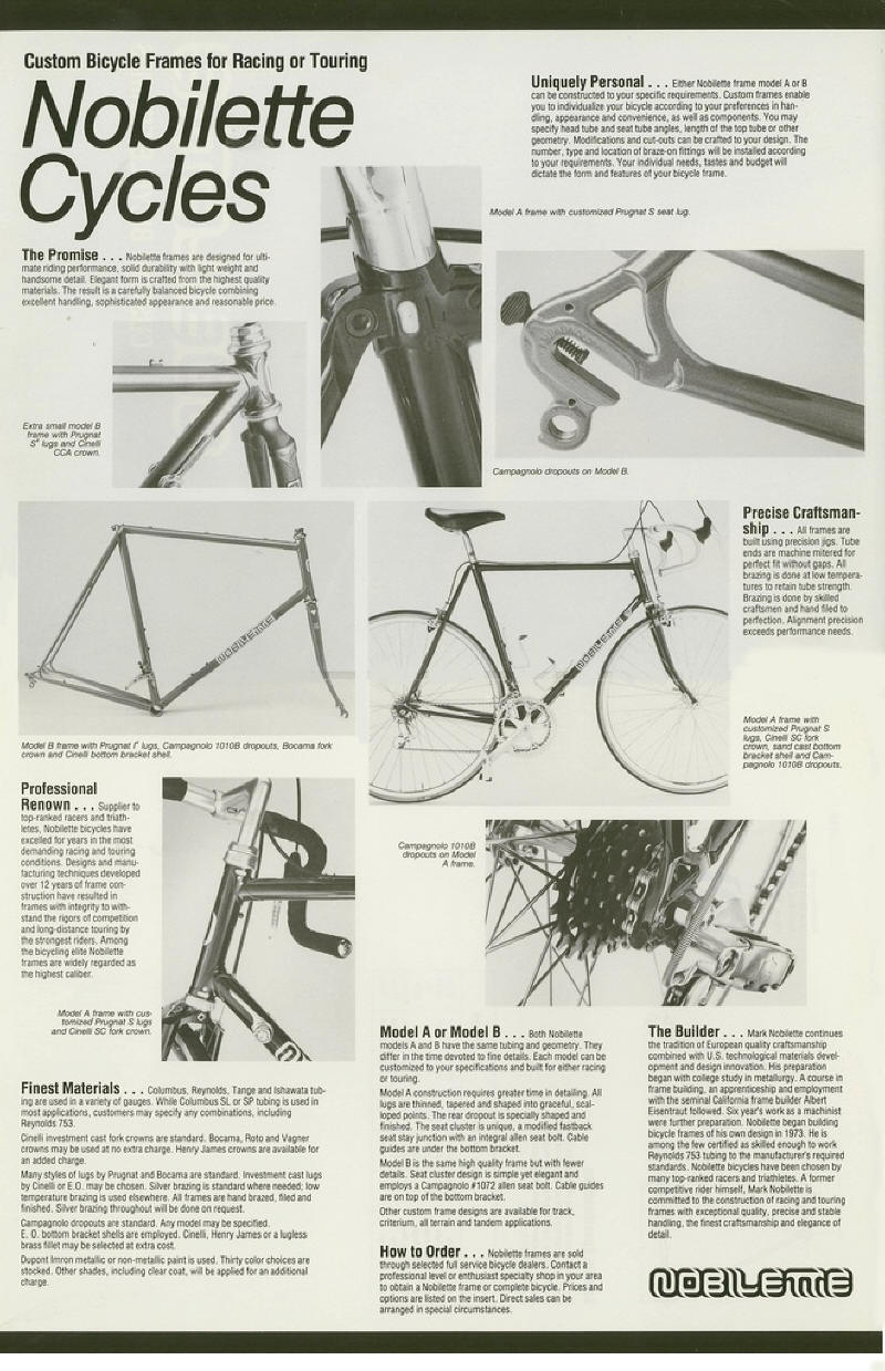 Originally from Ann Arbor, Michigan, Mark Nobilette began building bicycle frames in 1973 by enrolling in a 2 week Albert Eisentraut frame class in Chicago. He then worked for a year with Eisentraut. He has made many frames under his own brand, and also for GT, Fisher, Schwinn, Renи Herse, Zinn, Rivendell, VeloCult and others.