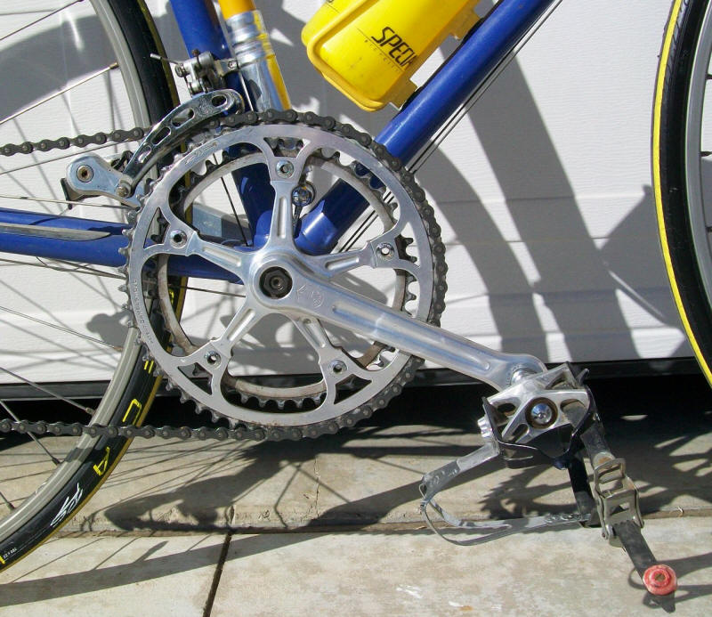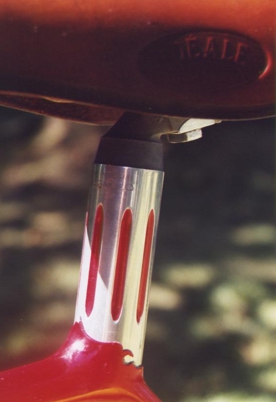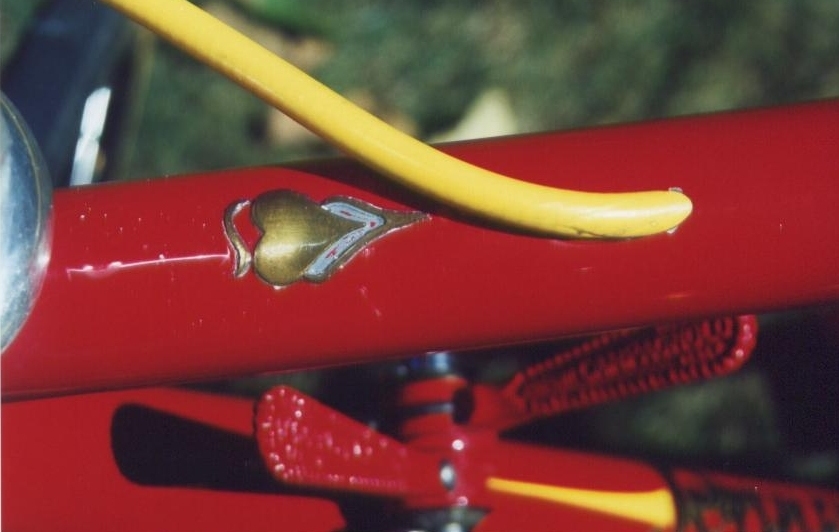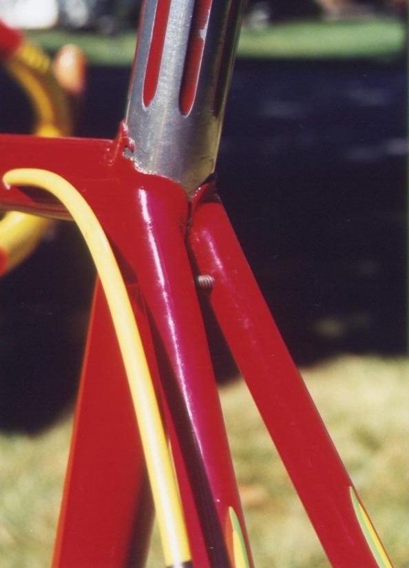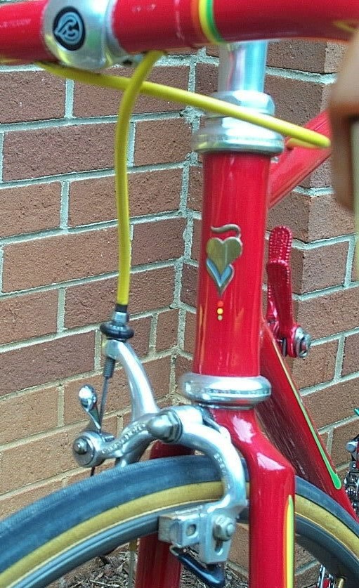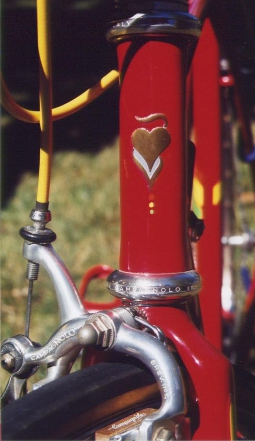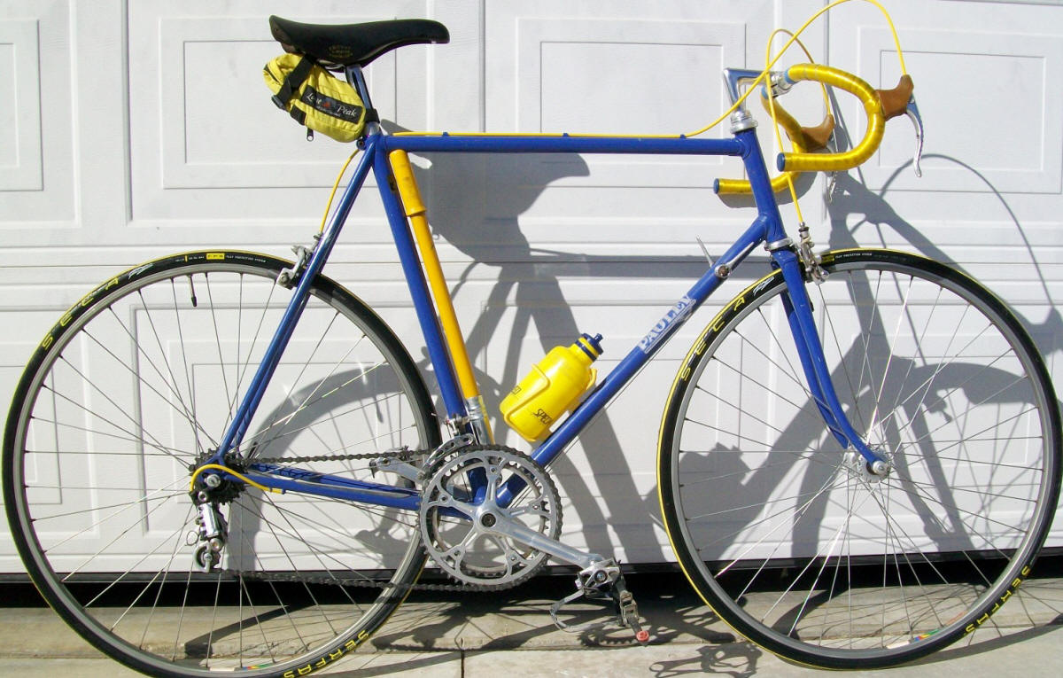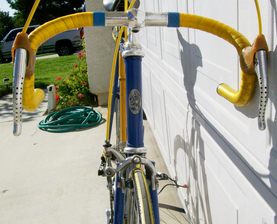 “The frame is a combination of Reynolds 531 and Columbus SL chrome-moly tubing. Back in the day, when I rode silks, it weighed about 18 lbs. The frame is painted with DuPont Imron which has held up pretty well over the past 30 years.”