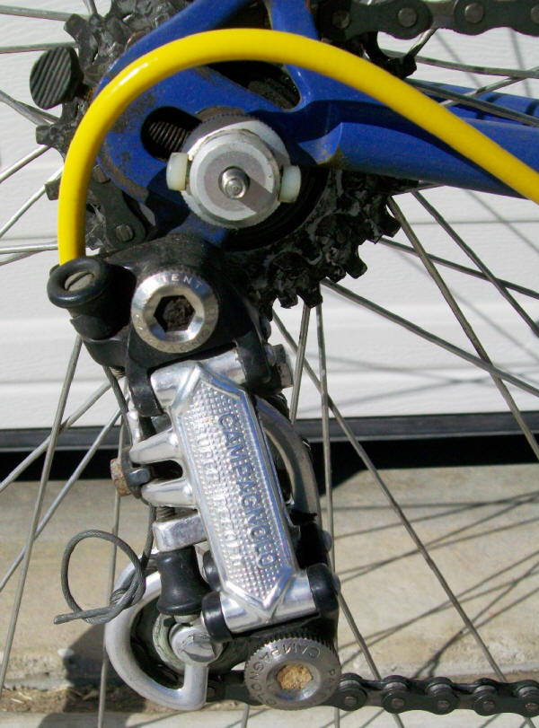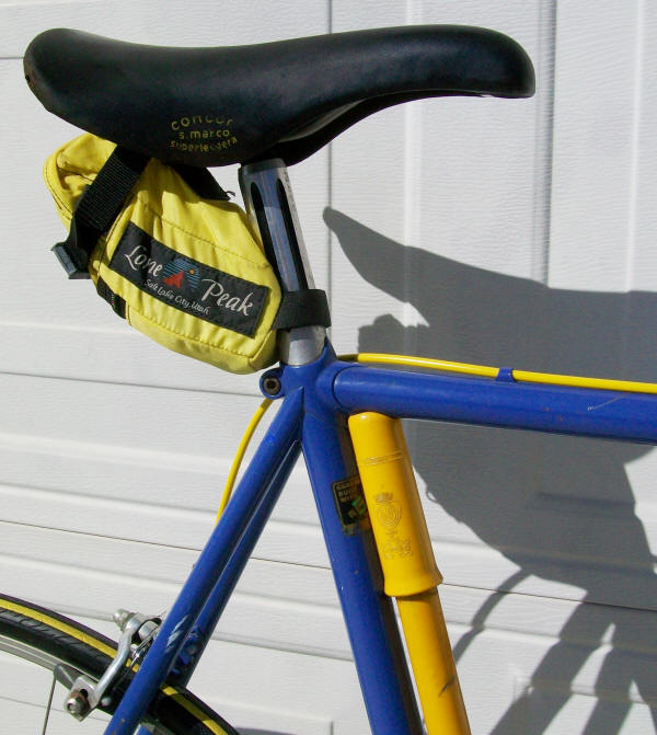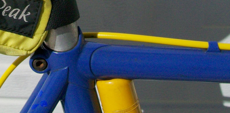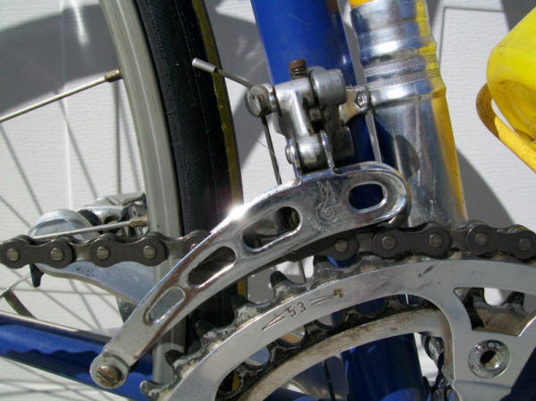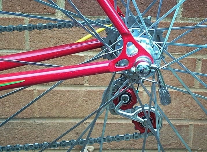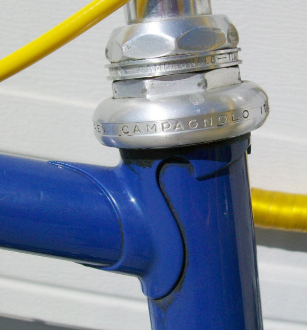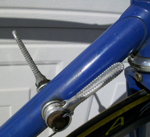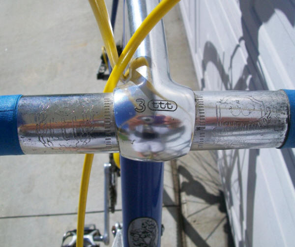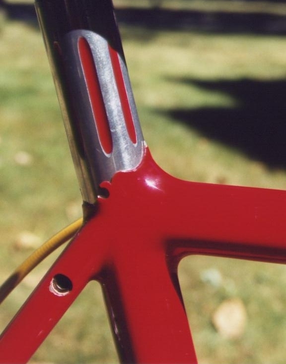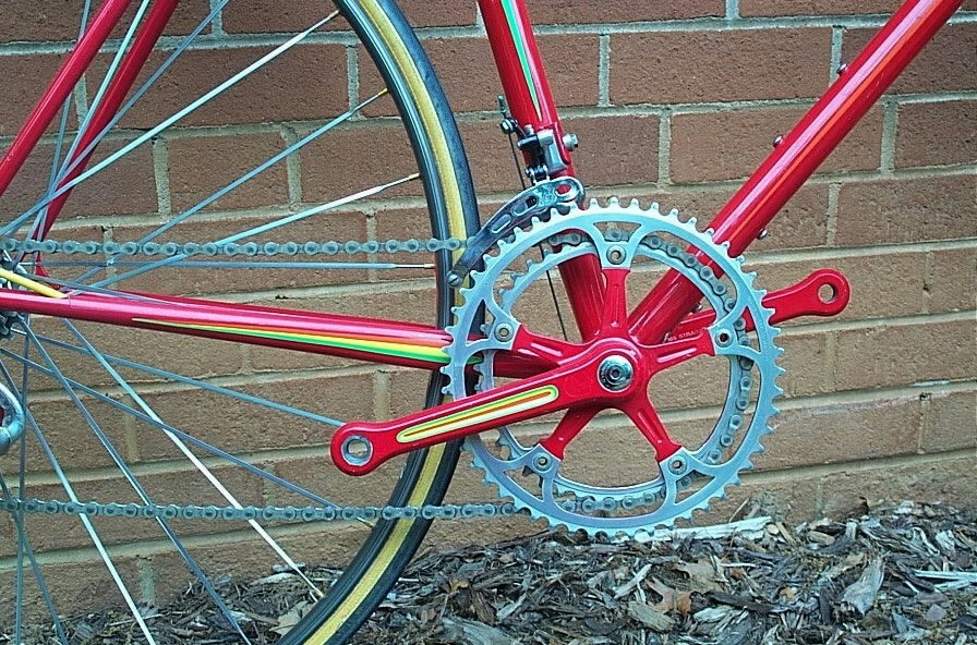 “The frame is a combination of Reynolds 531 and Columbus SL chrome-moly tubing. Back in the day, when I rode silks, it weighed about 18 lbs. The frame is painted with DuPont Imron which has held up pretty well over the past 30 years.”