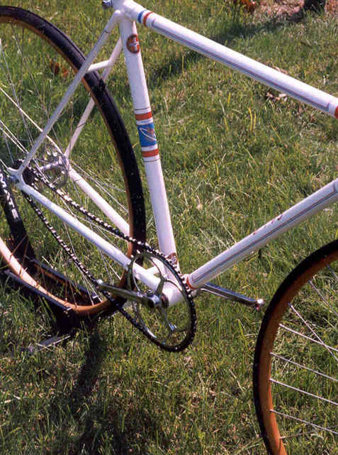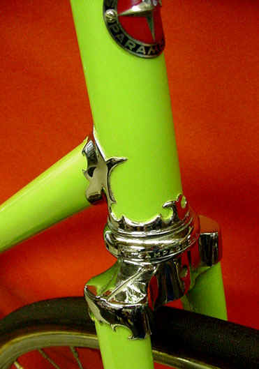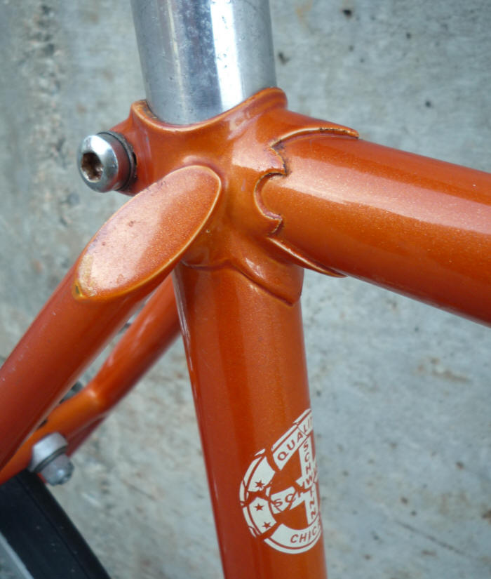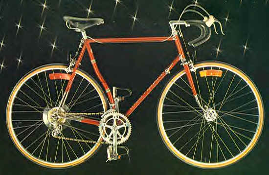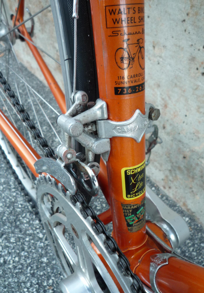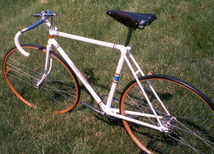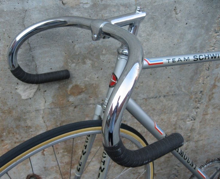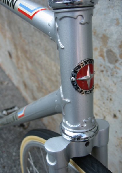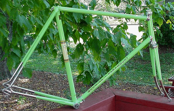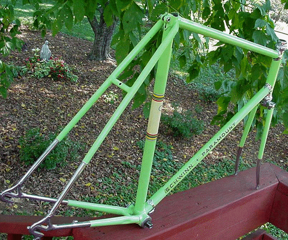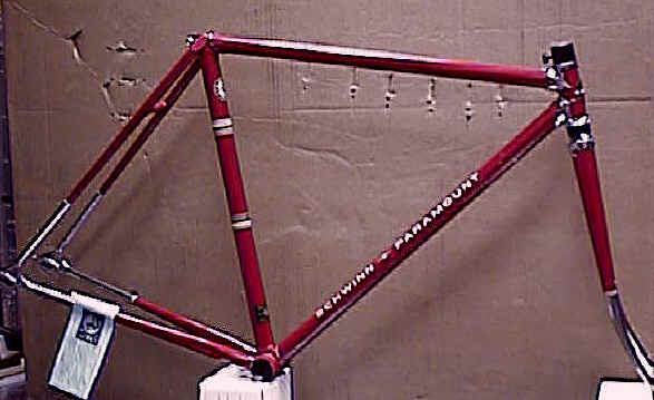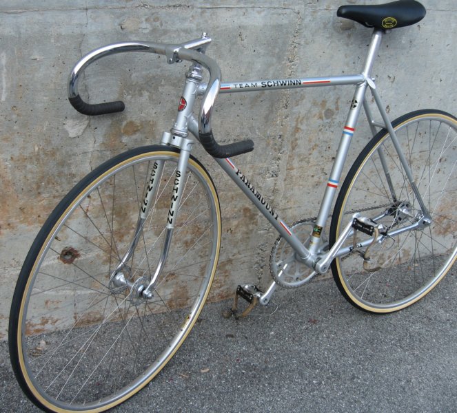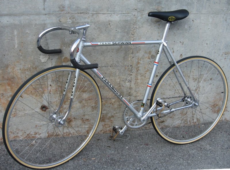 Built using frames and frame components (Nervex lugs and Reynolds 531 tubing) that were remaining when Schwinn stopped Paramount production in Chicago (due to quality issues) in 1979. Constructed by Don Mainland a Schwinn sub-contractor in Racine, Wisconsin. Don and partner Roger Nelson had a machine shop that built about 40% of the Paramount frames during the ’70s bike boom. Many of the full chrome Paramounts were built by Mainland; their brazing was better (less visible after chroming) than those that were done in Chicago.