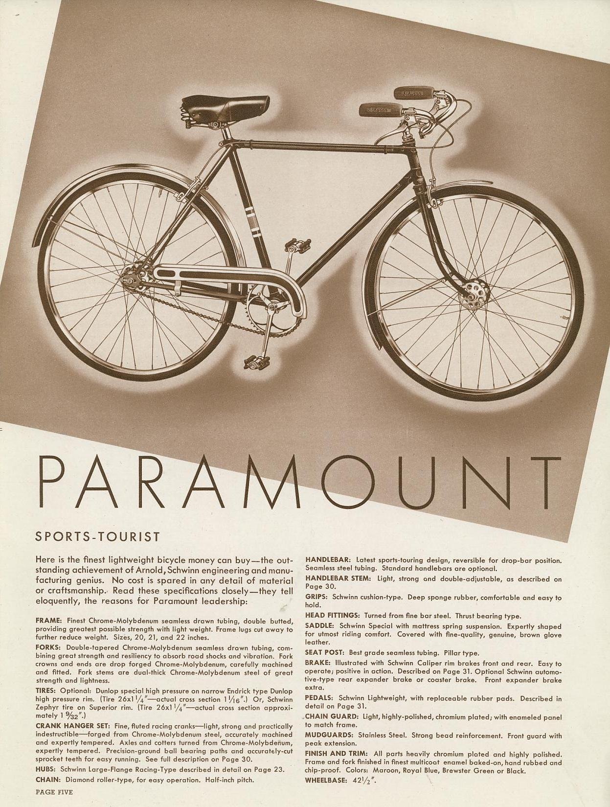 For the USA, the Schwinn bicycle company’s historical dynasty is very important. Many interesting bicycles were made by Schwinn but the most fascinating and now collectible are the Paramount models. From their introduction in the 1930s, the Paramount models were the dominant racing lightweight in America for 50 years.